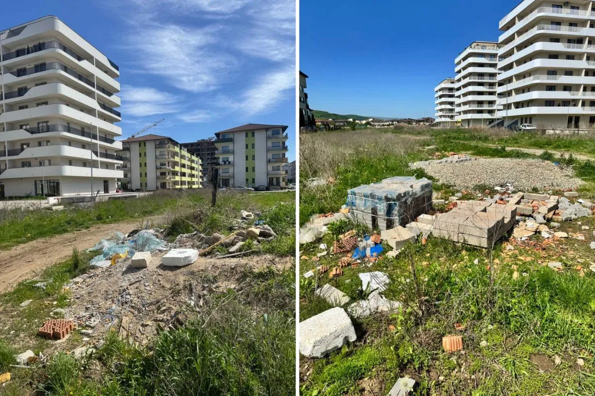 Fâșia de teren dintre blocuri s-a umplut de mormane de deșeuri din construcții. Cărămizile, foliile de plastic și sacii de ciment au fost aruncați fără nicio urmă de regret pe spațiul verde, pe iarba proaspăt încolțită.