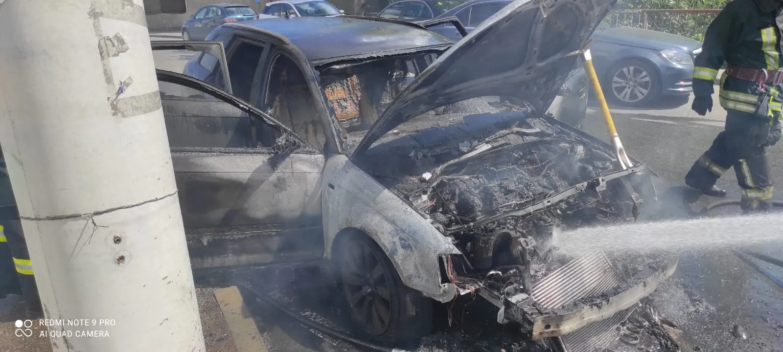 Flăcările au cuprins o mașină, care a fost distrusă parțial.