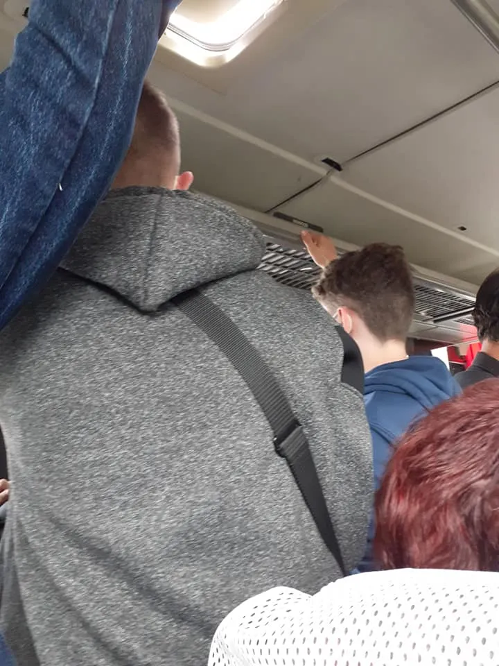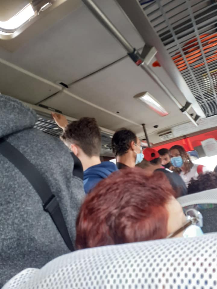 Pe un autobuz FANY, oamenii stăteau care cum puteau. Cu mască sau fără, chiar și în picioare pentru că nu mai era loc jos. Oamenii par a fi sătui să mai respecte regulile, atâta timp cât viața lor este afectată și nu le sunt oferite condiții pentru a călători în siguranță.