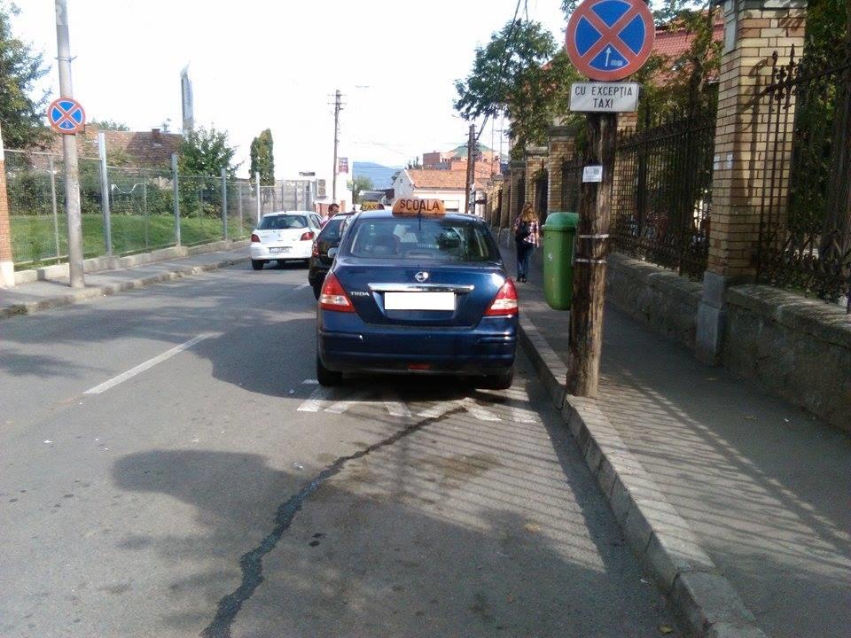 Un autoturism al unei școli de șoferi a fost forografiat pe strada Pasteur, parcat în standul de taxi, sub semnul care nu îi permite oprirea.