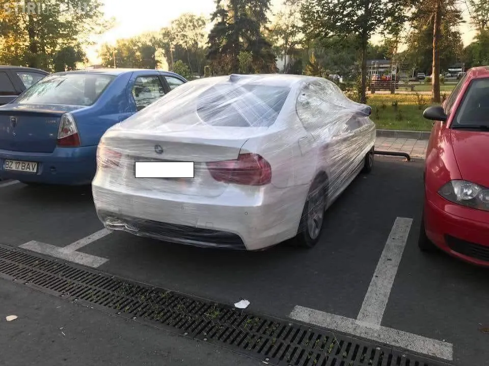 Autoturismul din imagini a fost împachetat în folie, iar proprietarul a avut un șoc.