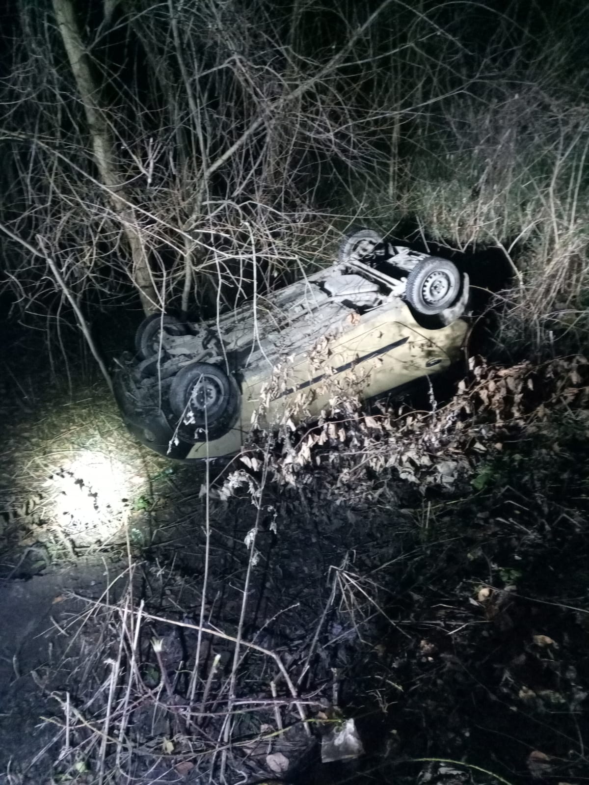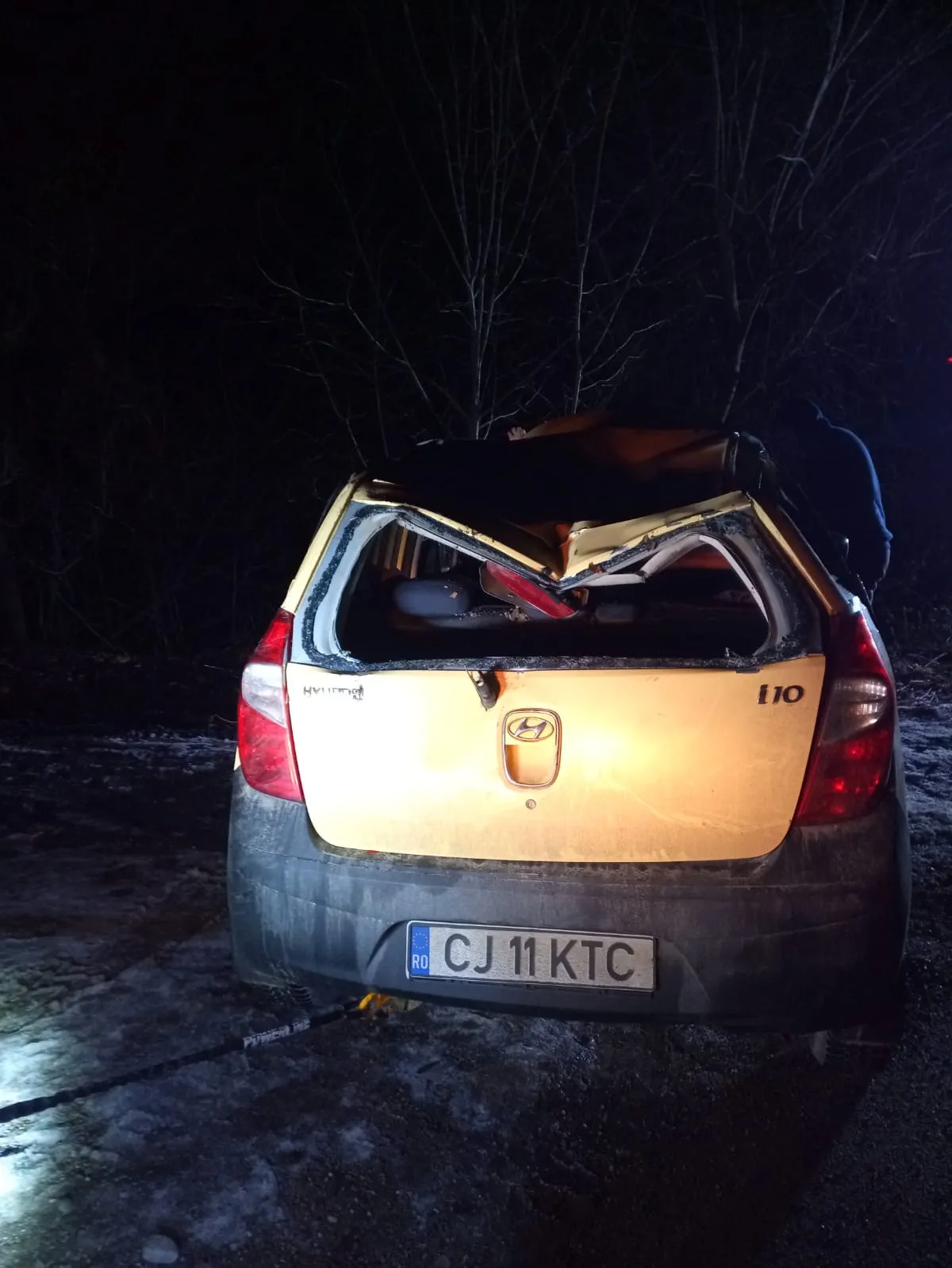 Încet, încet, ajungem la noul incident. O masina rasturnata într-o vale, 4 persoane, 2 adulți, 2 copii. Masina, un Hyundai, i-a fugit spatele și-a ajuns în șanț.