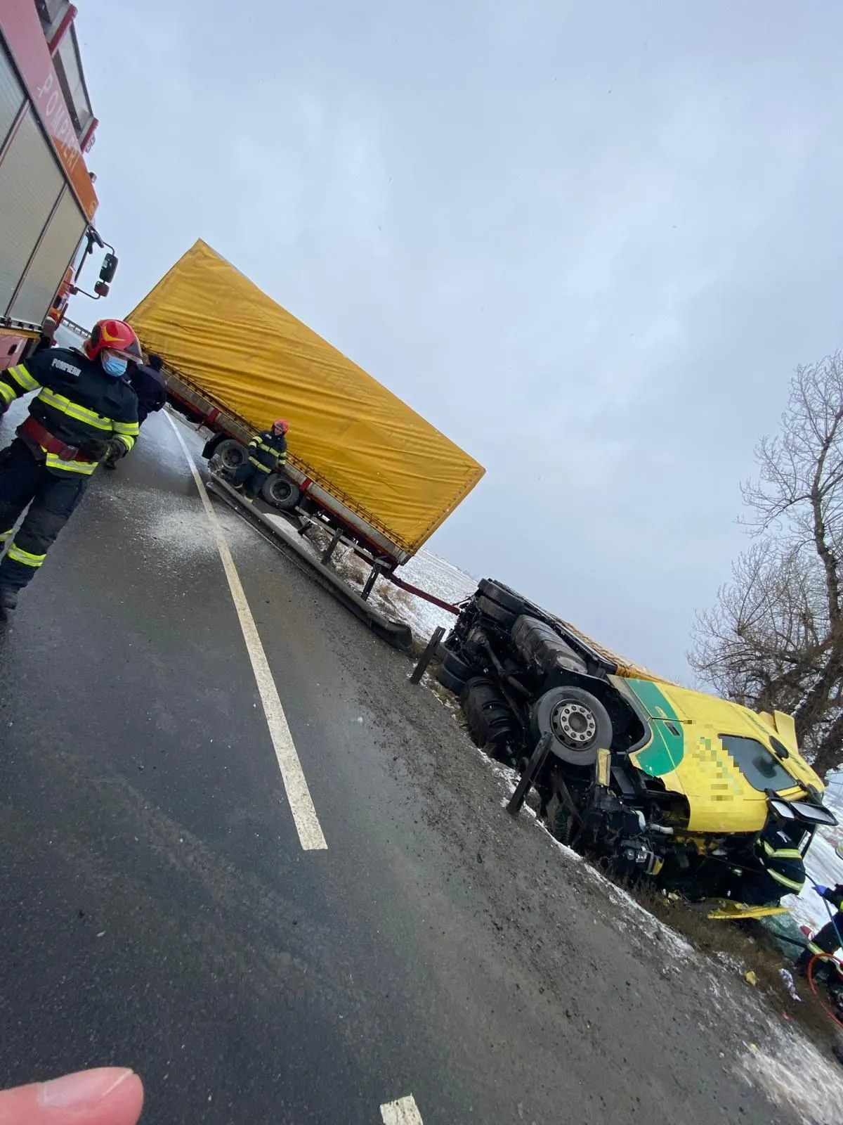Solicitarea pentru intervenția pompierilor a fost înregistrată în jurul orei 13.20, iar la fața locului au găsit un autocamion răsturnat în afara părții carosabile, iar șoferul acestuia în imposibilitatea de a ieși din cabină.