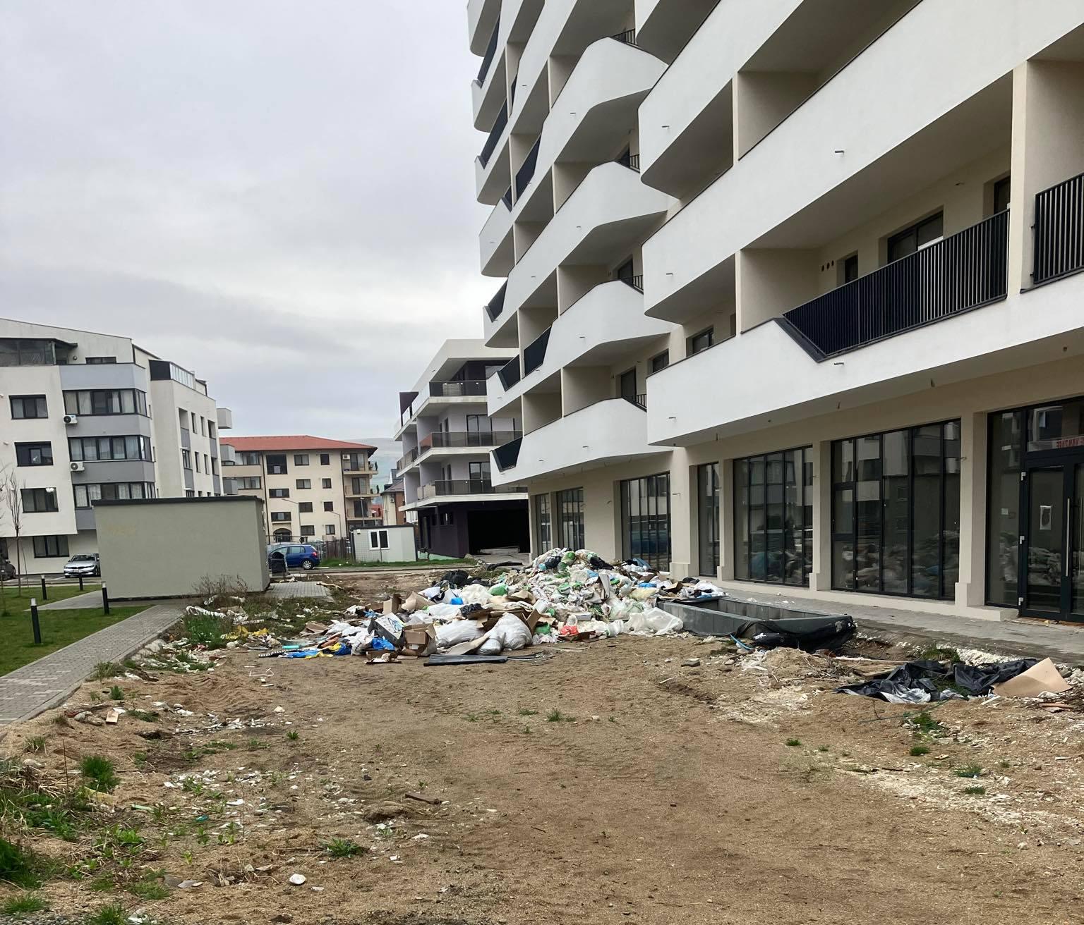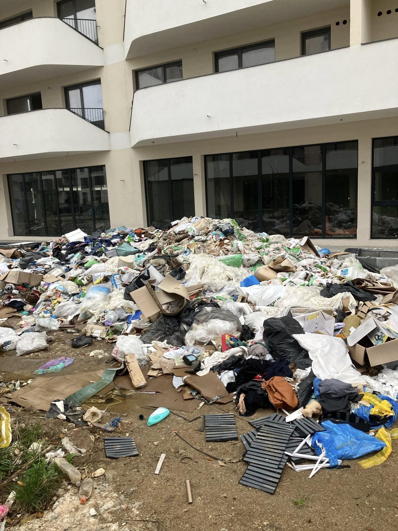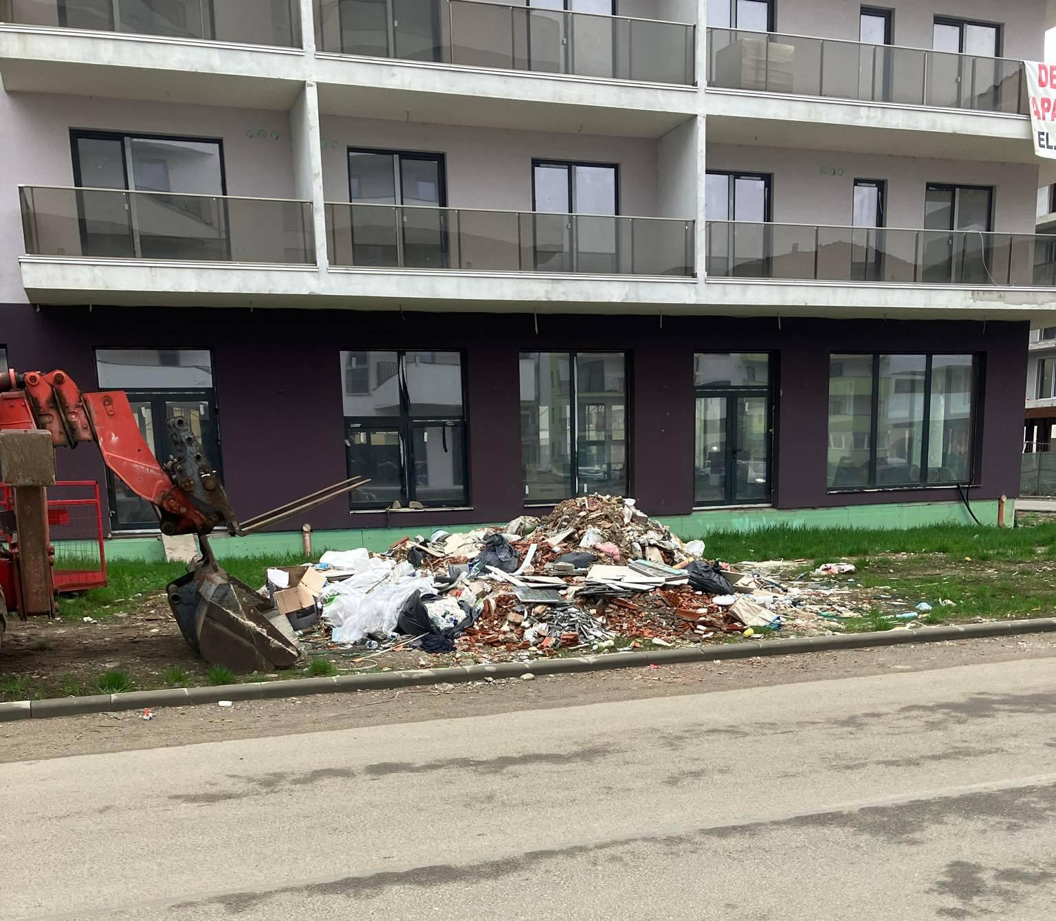 Mai multe mormane de deșeuri provenite din construcții au fost abandonate pe o distanță de aproximativ 100 de metri, împrăștiate haotic lângă blocuri și pe spațiile verzi din jur.