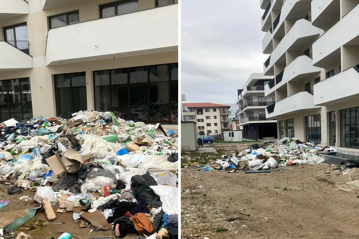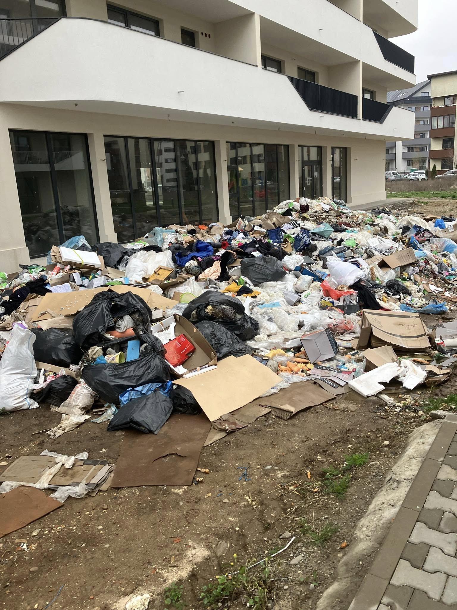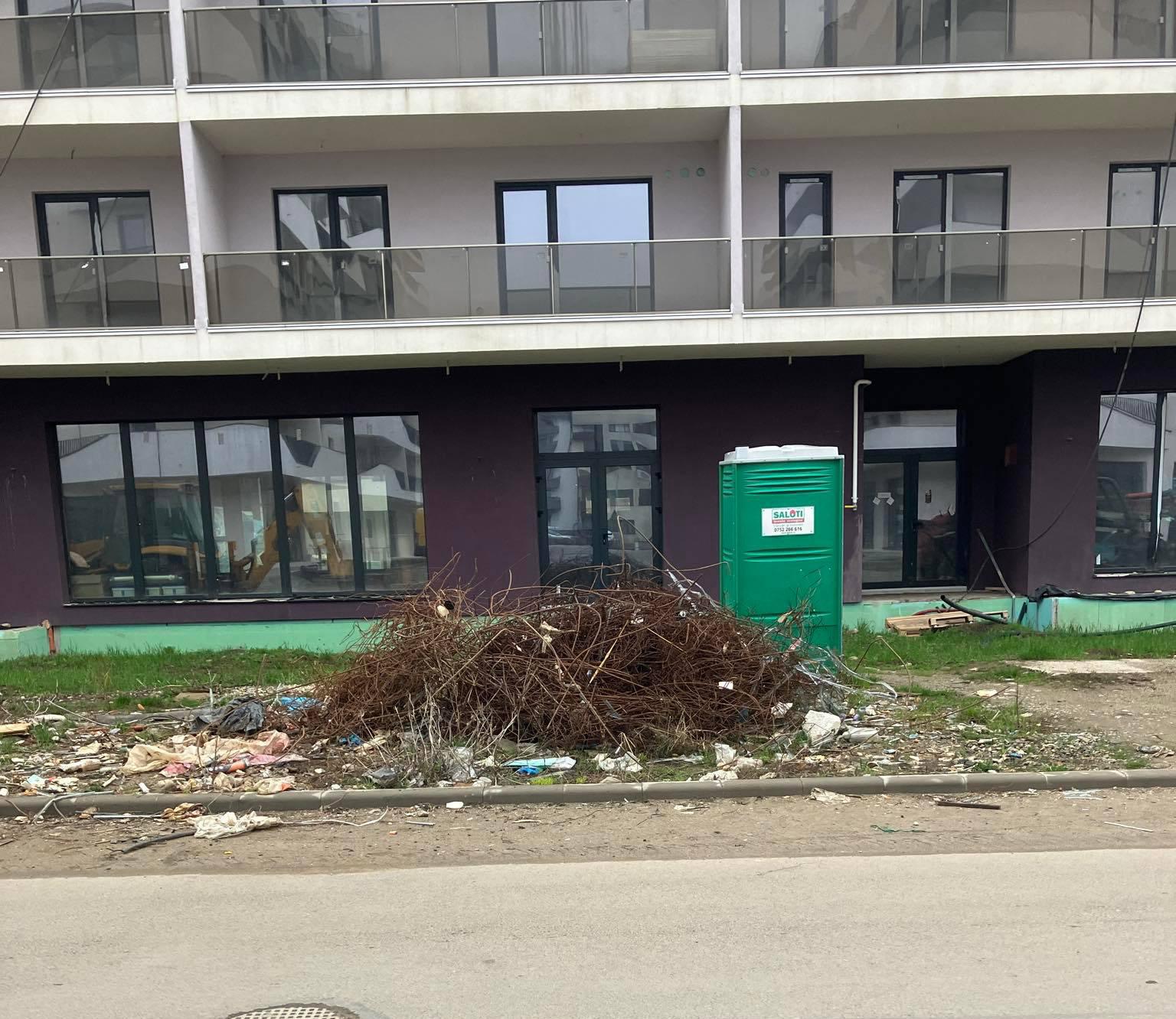 Mai multe mormane de deșeuri provenite din construcții au fost abandonate pe o distanță de aproximativ 100 de metri, împrăștiate haotic lângă blocuri și pe spațiile verzi din jur.