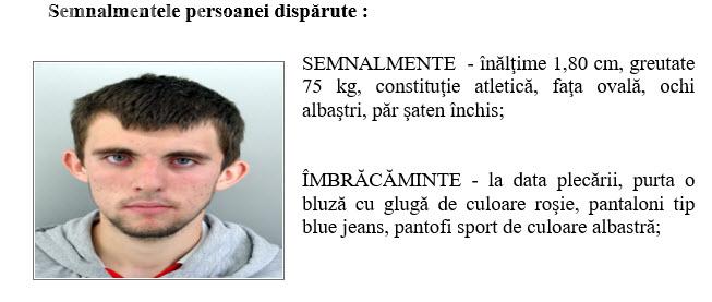 Un tânăr, de 20 ani, din localitatea Cluj-Napoca, judeţul Cluj, a plecat de la domiciliu, din data de 4 iulie a.c., şi nu a mai revenit.