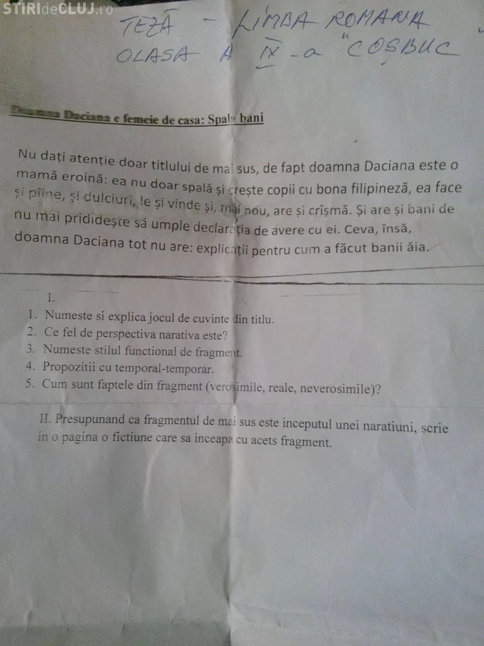 II. Presupunând că fragmentul de mai sus este începutul unei narațiuni, scrie în o pagină o ficțiune care să înceapă cu acest fragment”, se arată în documentul obținut de Știri de Cluj.