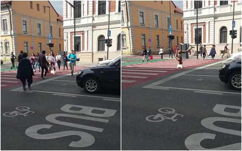 Doi acrobați au făcut spectacol în Piața Mihai Viteazu, pe trecerea de pietoni - VIDEO
