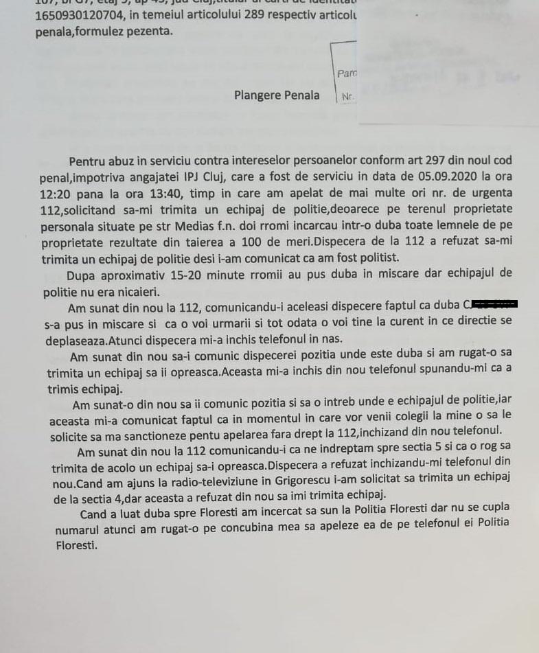 ”Eu am solicitat politia că am prins 2 hoți pe proprietate mea dar dispecera a refuzat să-mi trimită echipaj,amenintandu-ma că ma vor sancționa colegii ei deoarece țin telefonul de la 112 ocupat. Am fost 27 de ani polițist și am prins foarte multi hoți, dar când am avut eu nevoie dispecera a refuzat să-mi trimită echipaj de poliție. Intr-o zi m-am dus la terenul meu situat in Cluj- Napoca unde am găsit pe teren 2 rromi, care imi încărcau toate lemnele groase situate din tăierea a peste 100 de meri in vastă de peste 50 ani. Am sunat la 112 comunicând eventual și solicitand un echipaj de poliție comunicandu-i dispecerei că am fost polițist. Dupa aproximativ 20 de minute duba cu cei 2 rromi s-a pus în mișcare iar eu am inceput urmărirea lor. Am sunat la 112, comunicând dispecerei că aceștia s-au pus în mișcare, iar eu îi urmăresc și că încă nu a venit niciun echipaj, dar dispecera mi-a închis telefonul. Am sunat din nou să comunic unde suntem și să ii solicit sa trimită un echipaj sa ii oprească, dar dispecera mi-a închis telefonul in nas. Am sunat din nou să comunic unde suntem solicitand din nou un echipaj dar dispecera m-a amenințat că la sosirea echipajului la mine le va solicita acestora să mă sancționeze că am ținut telefonul de 112 ocupat, inchizandu-mi din nou telefonul. Am mai sunat de 2 sau 3 ori după care am ieșit din municipiul Cluj Napoca spre Florești. Am sunat la Secția 4 să mă ajute dar nici un ajutor. Am sunat la Secția Florești unde echipajul era la un eveniment la Piata Auto, dar mi-au comunicat că după ce termină acolo vor veni la mine. Am ținut legătura cu echipajul din Florești urmărind duba până în țigănimea din Florești. I-am urmărit din depărtare, iar după aproximativ 15 minute a venit echipajul din Florești care a luat măsuri”. ne-a relatat clujeanul.