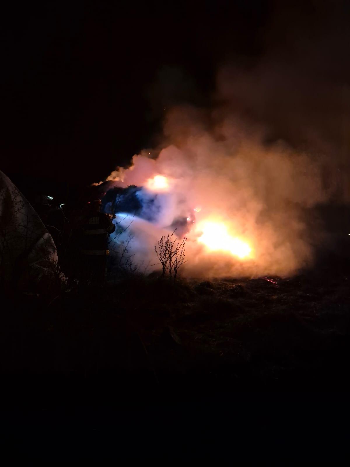 UPDATE ora 20.45 Focul nu a fost stins încă. Pompierii luptă cu flăcările de două ore și jumătate și au reuit să evite aprinderea altor 100 de baloți de fân.