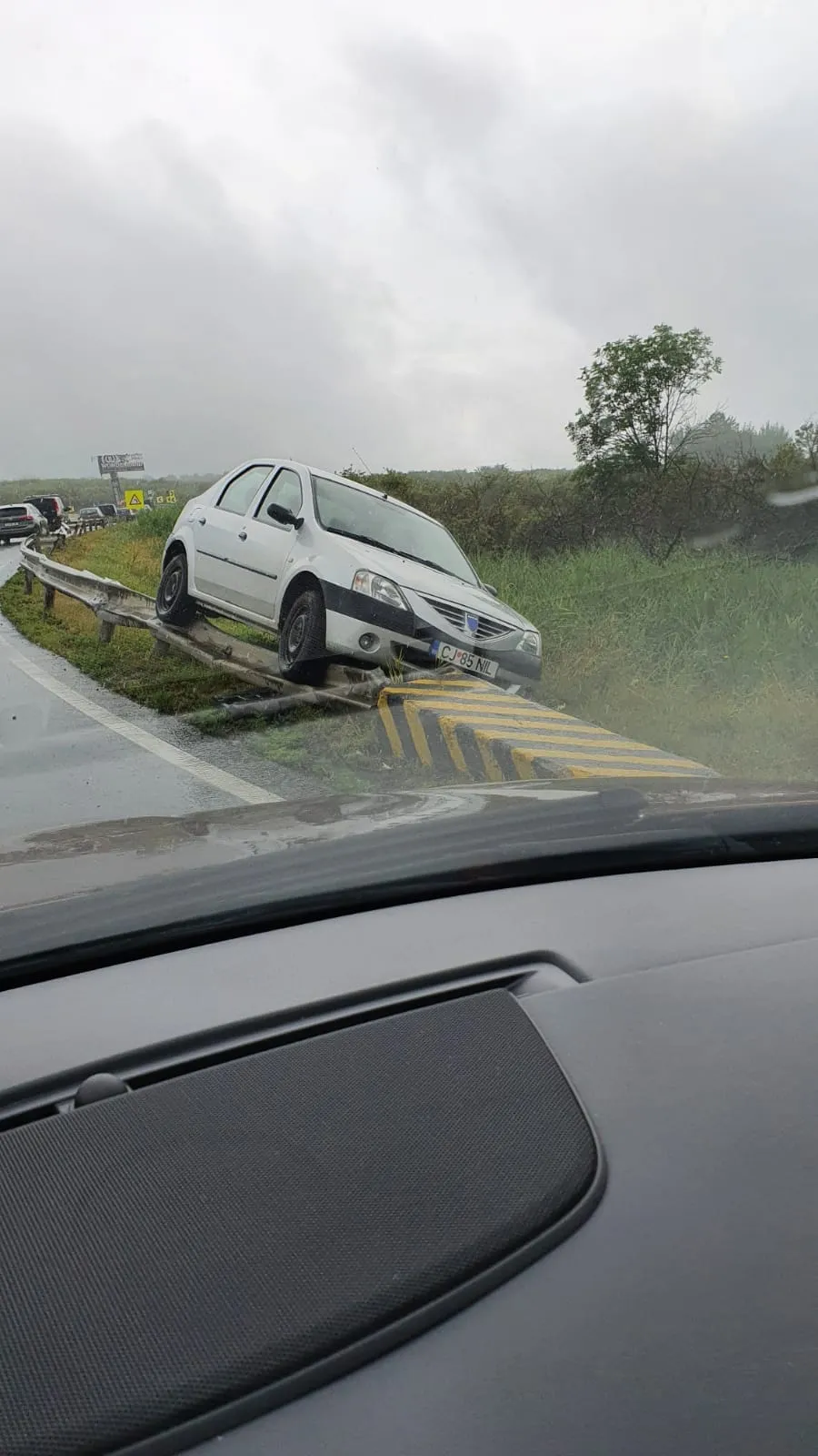 Un Logan a fost surprins la urcare pe Dealul Feleacului, cărățat pe parapet. Nu doar că mașina se află peste parapet, dar se află și pe contrasens.