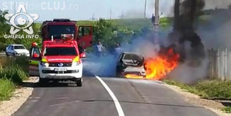 În scurt timp, maşina a fost cuprinsă de flăcări. Un şofer din Gherla, aflat în trafic, a sunat imediat la 112. In apropiere, angajații unei ferme au observat mașina în mers, de sub care ieșeau flacări. Până la sosirea pompierilor, au încercat să lichideze focul cu stingătoare, însă a fost o misiune imposibilă, scrie gherlainfo.ro.