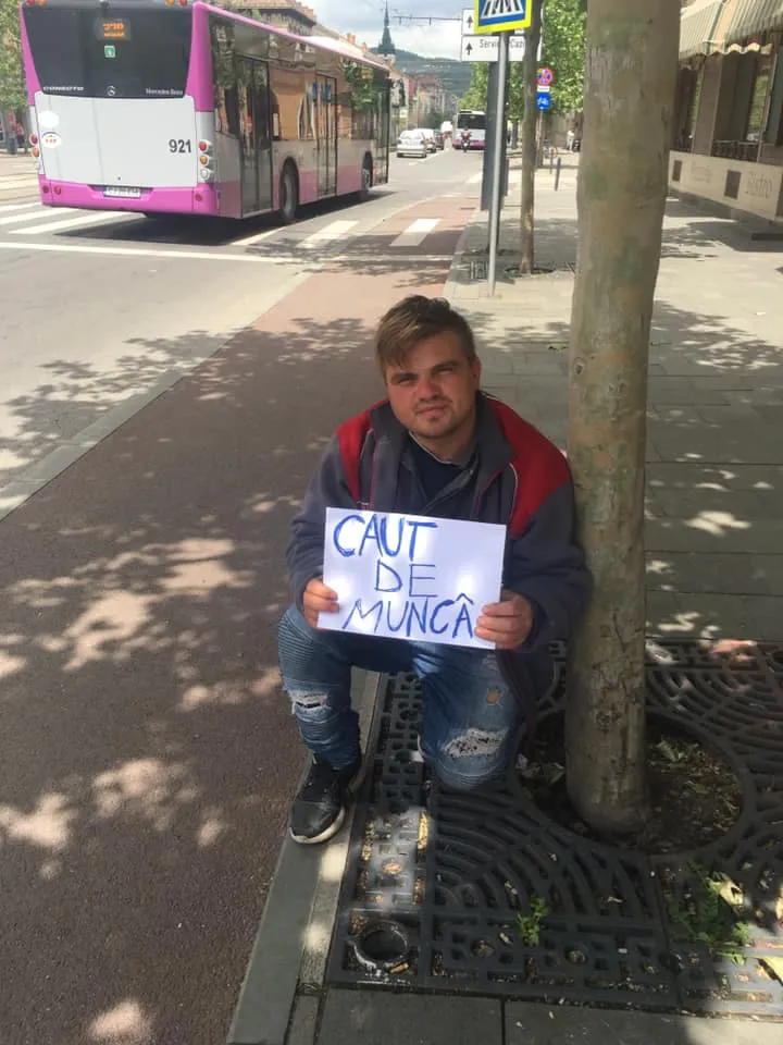 Acesta s-a așezat pe strada Horea, cu o pancartă în mână, în speranța de a-și găsi un job.