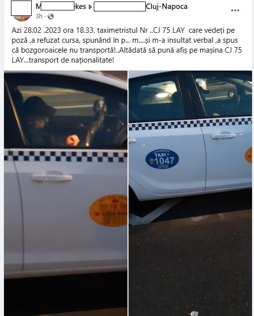 ”Azi, 28.02.2023, ora 18.33, taximetristul Nr. CJ 75 LAY, pe care îl vedeți în poză, a refuzat cursa, spunând în p... m....și m-a insultat verbal. A spus că bozgoroaice nu transportă!... Altădată să pună afiș pe mașina CJ 75 LAY.. .transport de naționalitate!”, a explicat clujeanca, extrem de indignată.
