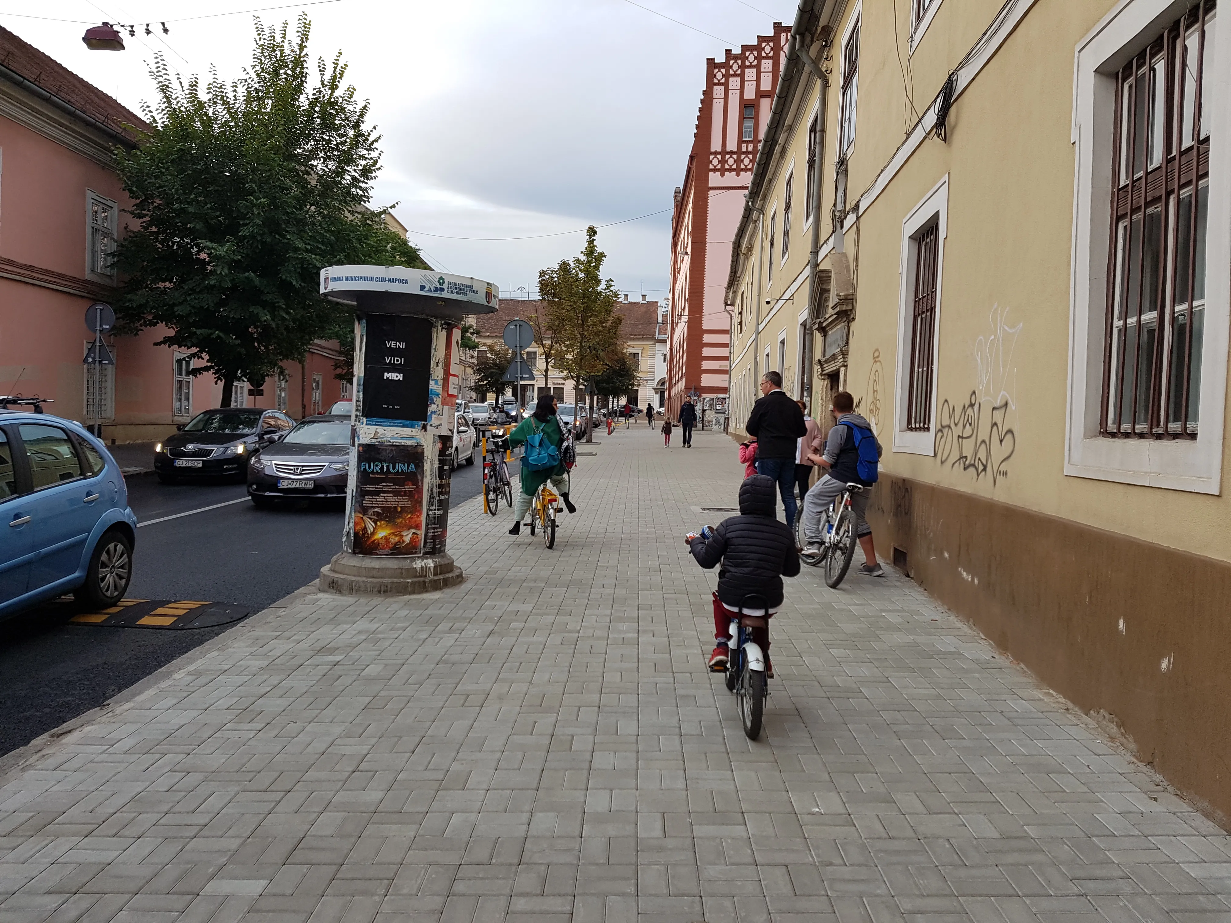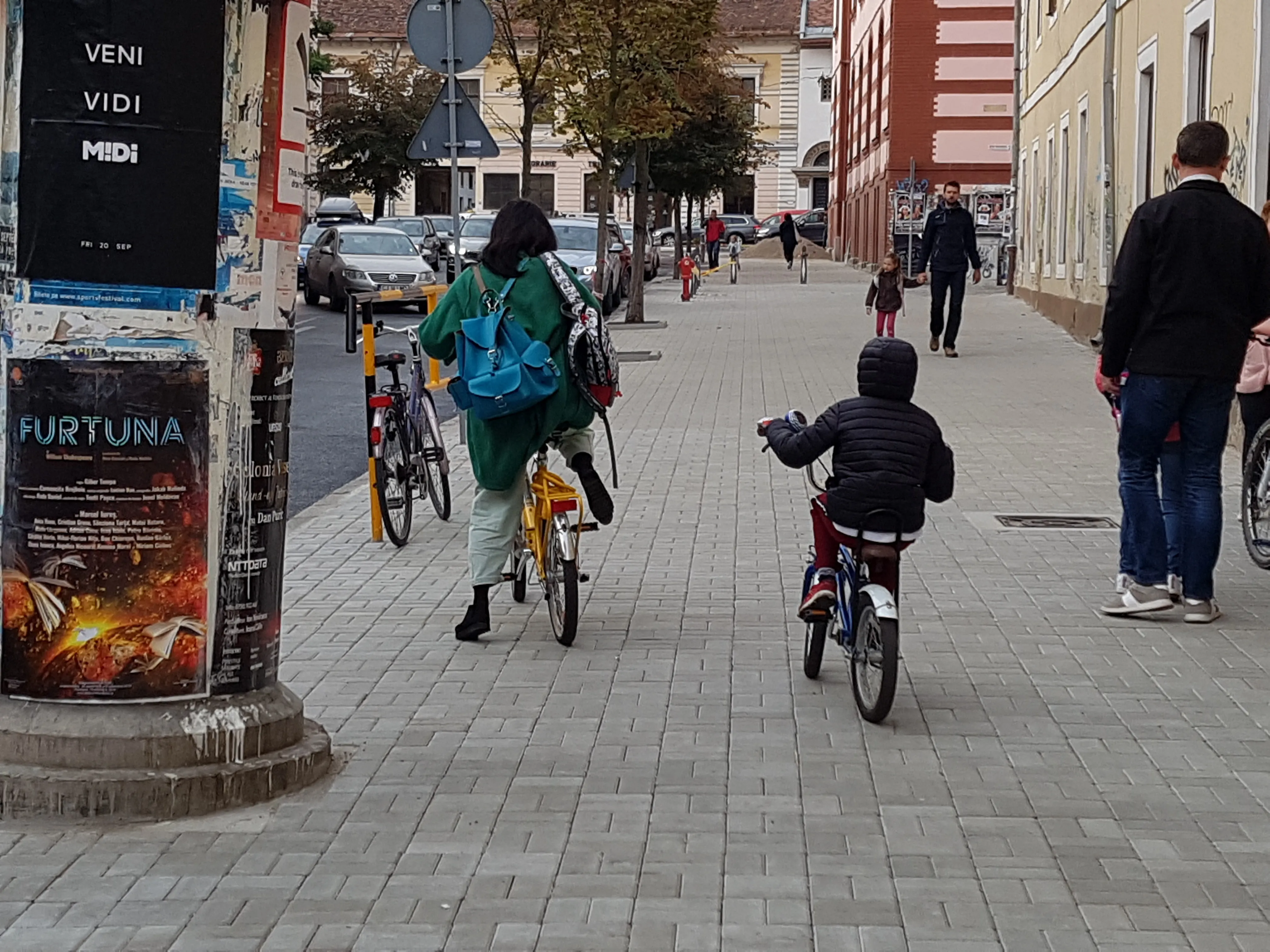 Mai jos, pe strada Universității, în zona Liceulu Bathory, părinții mergeau pe jos cu cei mici sau chiar pe bicicletă.