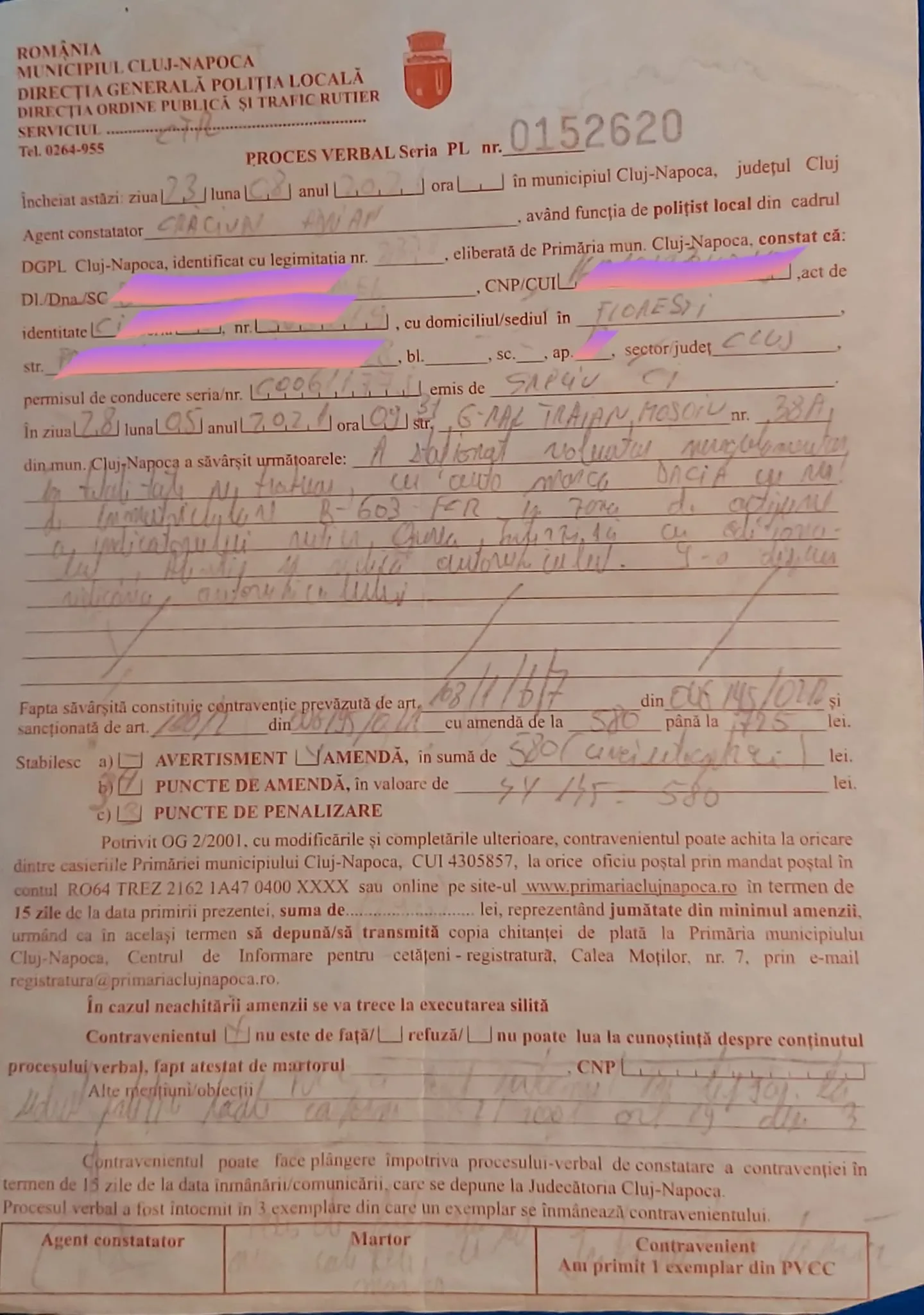 Un clujean a relatat cum a fost amendat și i-a fost ridicată mașina de Poliția Locală. Cetățeanul a achitat amenda, dar după două luni a mai primit una, pentru că polițistul local a uitat că l-a amendat deja.