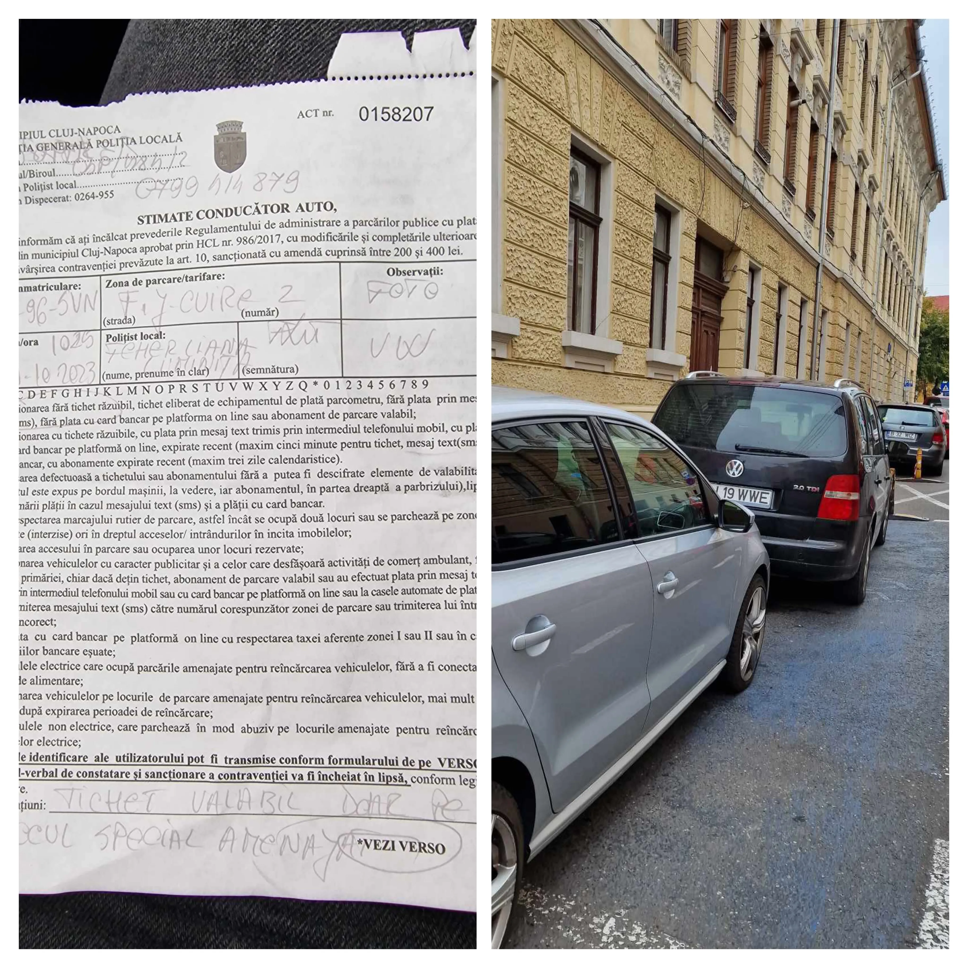 “Am parcat autovehiculul personal, VW Polo, pe un loc de parcare marcat cu vopsea albastra destinat persoanelor cu dizabilități, având in geam tichetul aferent pentru astfel de locuri, eu fiind persoana încadrată in grad de handicap (a se vedea poza). Cănd m-am întors la masina aveam in parbriz amenda cum ca nu am achitat parcarea, desi astfel de locuri amenajate sunt gratuite. Ulterior, am sunat pe doamna politist local Feher Liliana care mi-a spus ca acel loc de parcare ar fi desfiintat si ca acum este cu regim de plata desi i-am comunicat ca este clar locul de parcare cu vopsea albastra pe asflat. Dansa mi-a comunicat ca nu are ce face si sa fac eu cerere la serviciul parcari pentru a sterge marcajul. Nu am rezolvat nici la dispeceratul politiei locale, nici la serviciul parcari. Singura rezolvare parțială ce s-a întâmplat a fost dupa ce am luat legătura cu viceprimarul Dan Tarcea pe Facebook, iar a doua zi marcajul a fost șters.