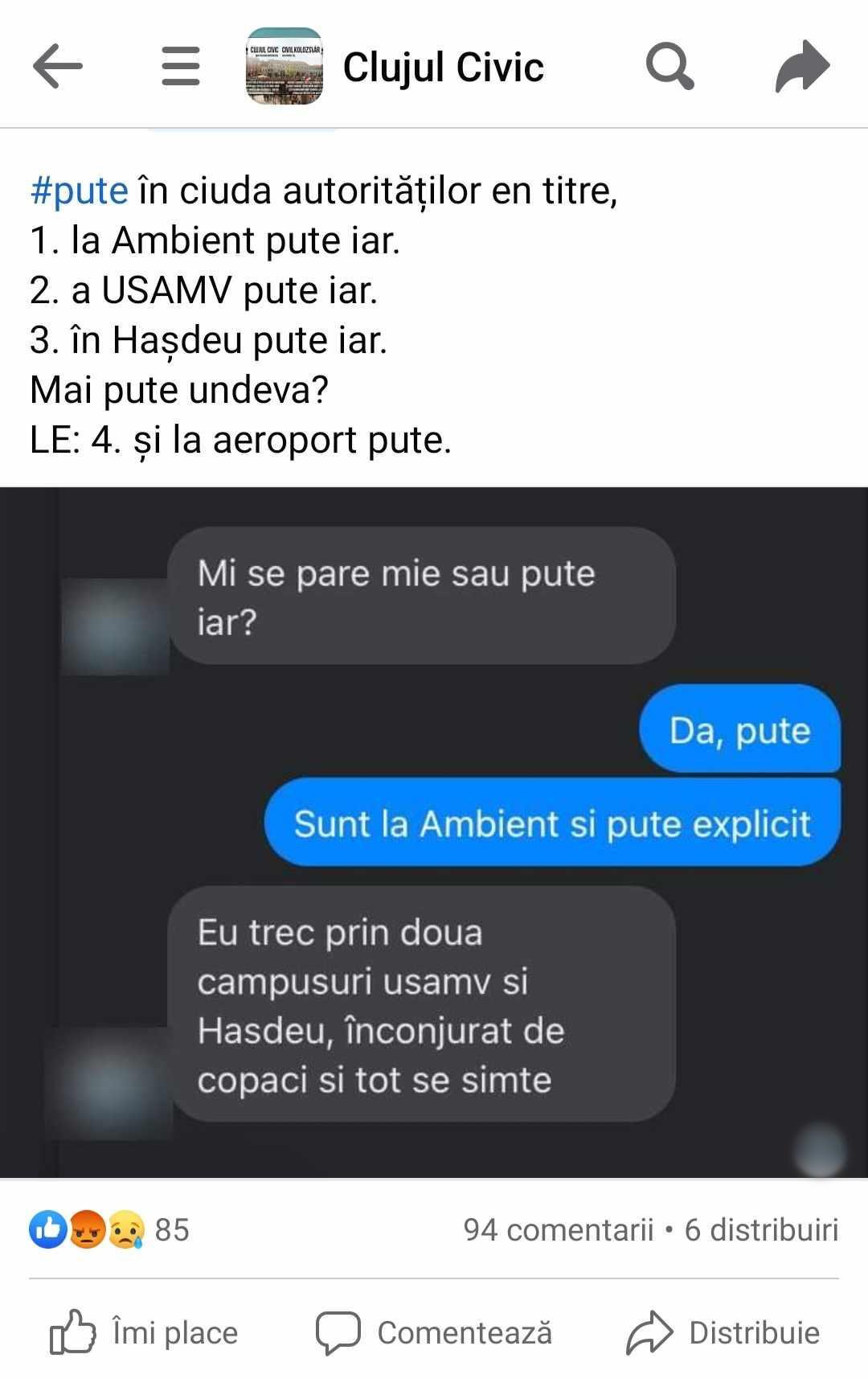 Civicii clujeni au făcut din nou o „hartă” a putorii din Cluj. Noul miros al „orașului de 5 stele” se simte în tot orașul: Hașdeu, USAMV, Iulius Mall, Mărăști și desigur la aeroport, au comentat clujenii.