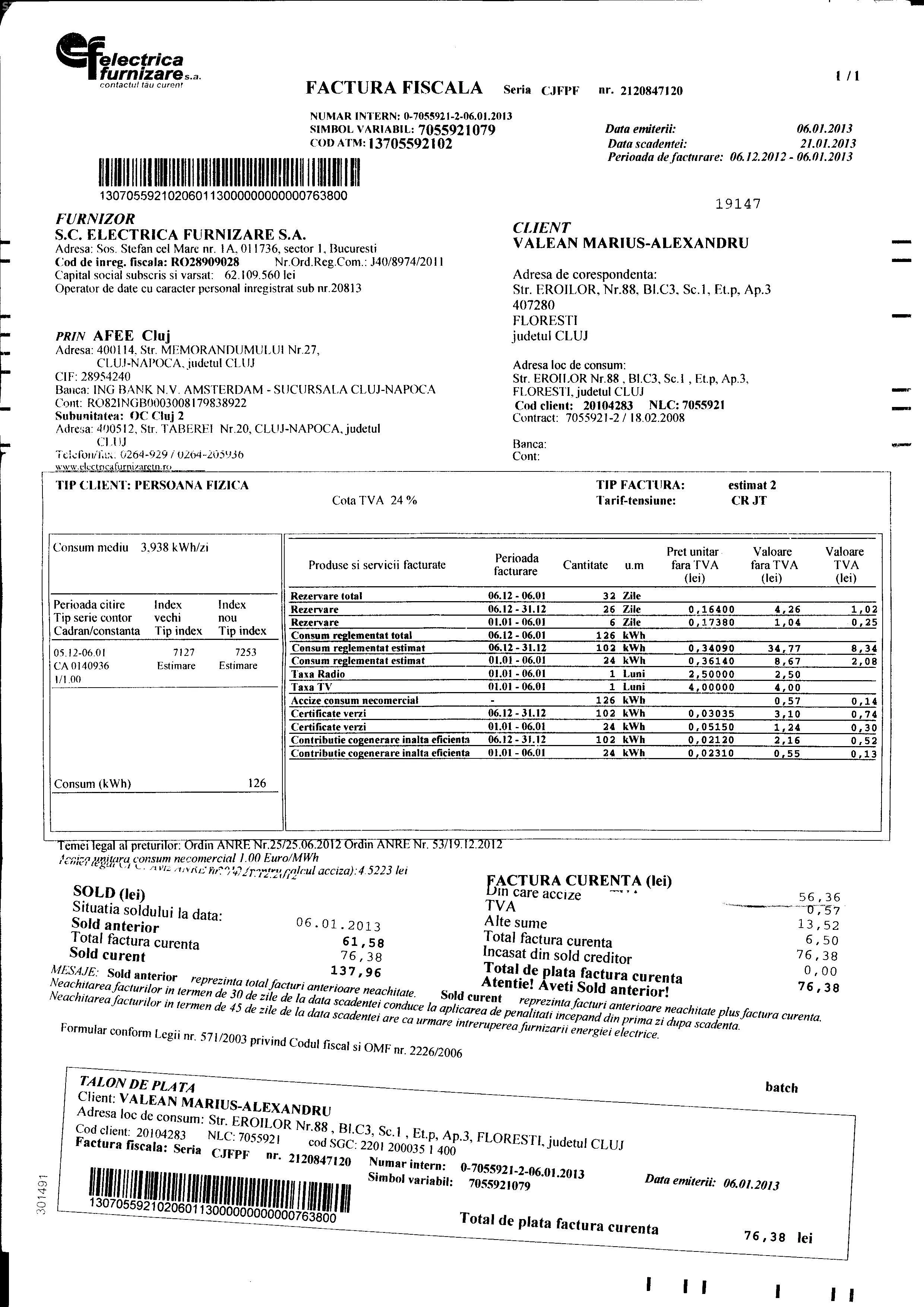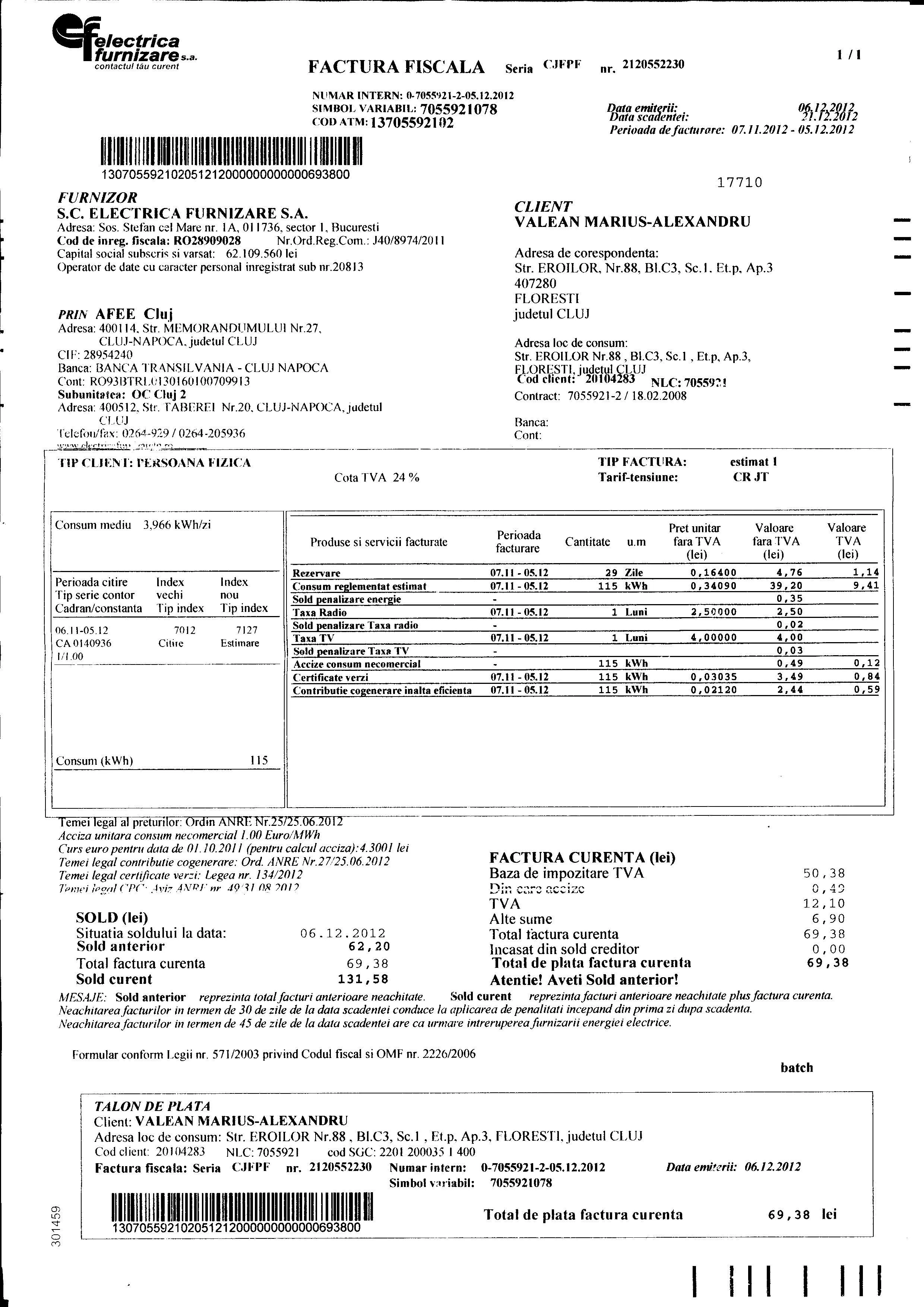 ”Pe parcursul lunii decembrie 2012 am achitat o factura de Electrica la sucursula BRD din Polus Center (ghișeu). Menționez că neavând la îndemână factura aferentă lunii noiembrie, pe care intenționam să o achit (motivul fiind neprimirea facturii), am avut la îndemână factura de pe decembrie și luând în considerare soldul anterior (62 lei) am achitat o sumă fixa de 70 lei.