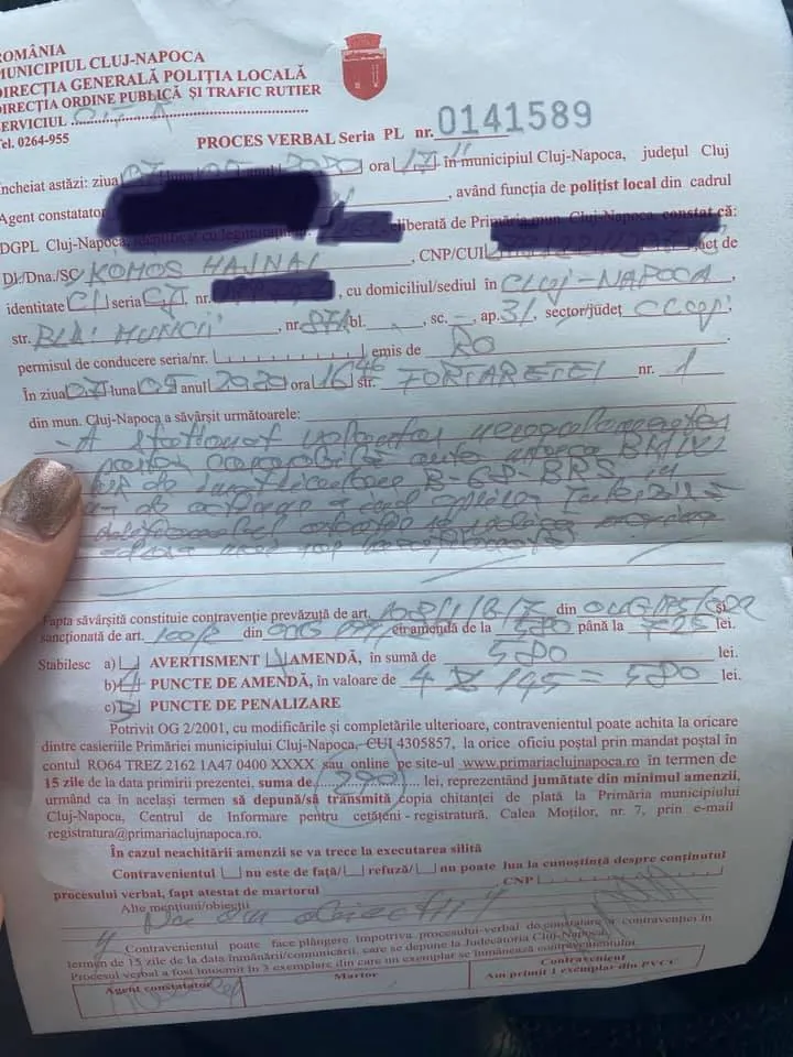 Hajny Komos, o clujeancă ce livrează mâncare cu mașina personală celor din linia întâi în lupta cu coronavirusul, dar și celor care nu își permit o masă, a fost amendată de Poliția Locală.