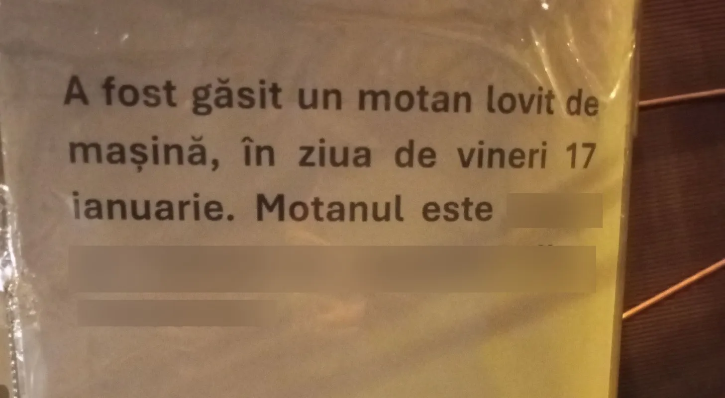 ,,A fost găsit un motan lovit de mașină, în ziua de vineri 17 ianuarie. Motanul este negru cu mască și șosețele albe, necastrat.