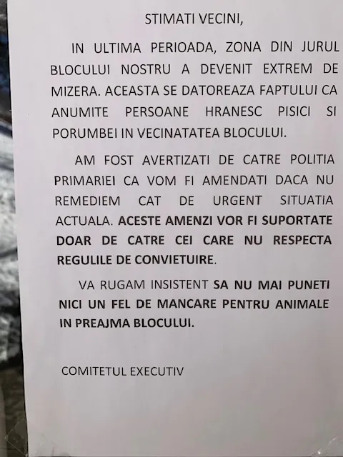 Oamenii care locuiesc într-un bloc clujean au fost informați că riscă amenzi, dacă mai dau de mâncare pisicilor, pe motiv că fac mizerie.