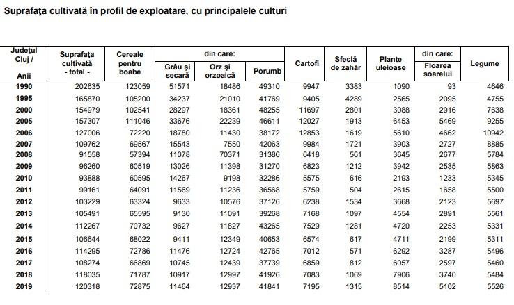 Față de 1990, suprafața agricolă a județului Cluj s-a înjumătățit în prezent, foarte multe terenuri fiind abandonate sau au ajuns pe mâna dezvoltatorilor imobiliari. Cu toate acestea, dacă ne uităm la anii 2008 - 2011, când a fost ultima criză financiară, vedem că atunci lucrurile au stat chiar mai rău decât în prezent.