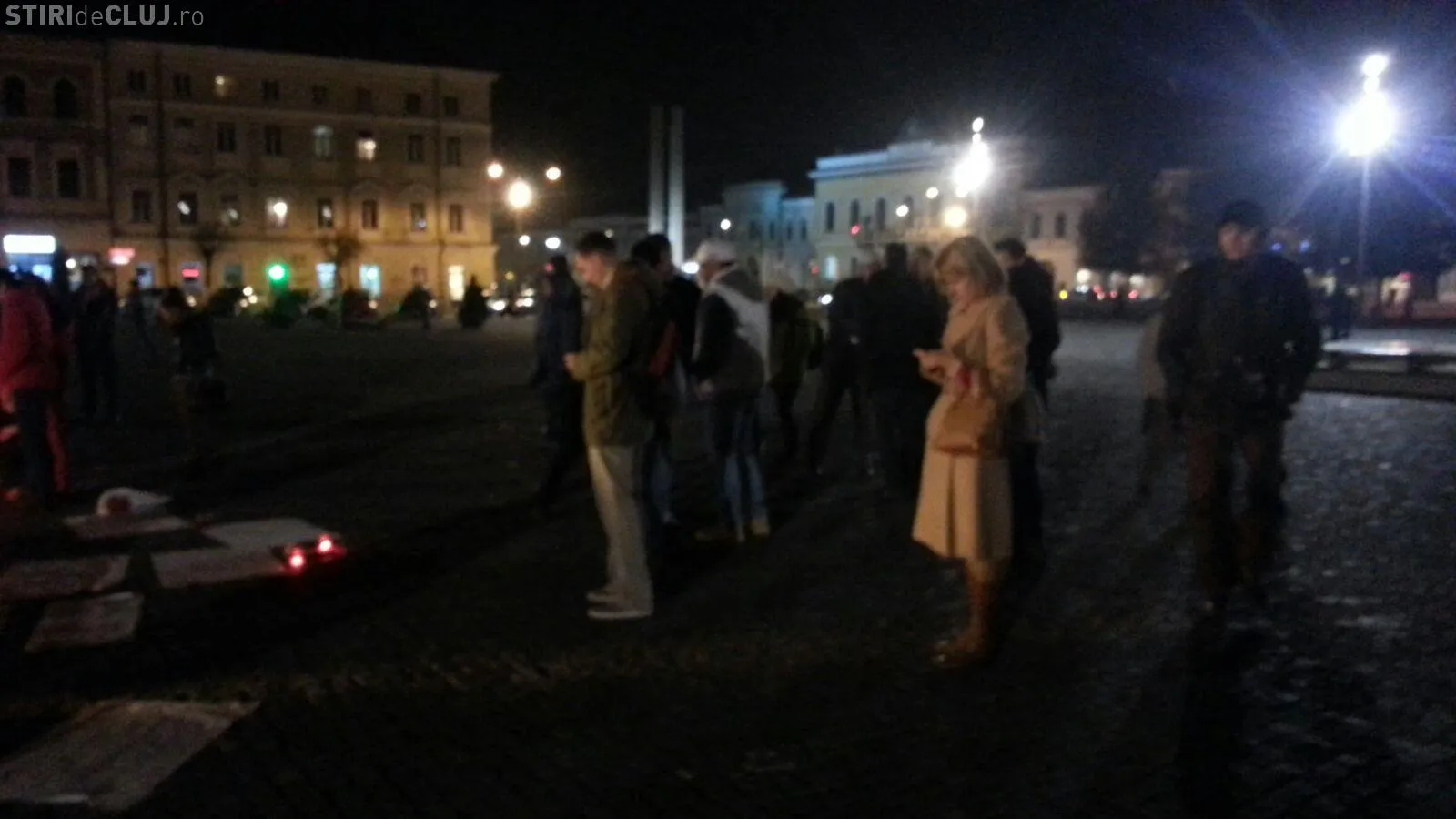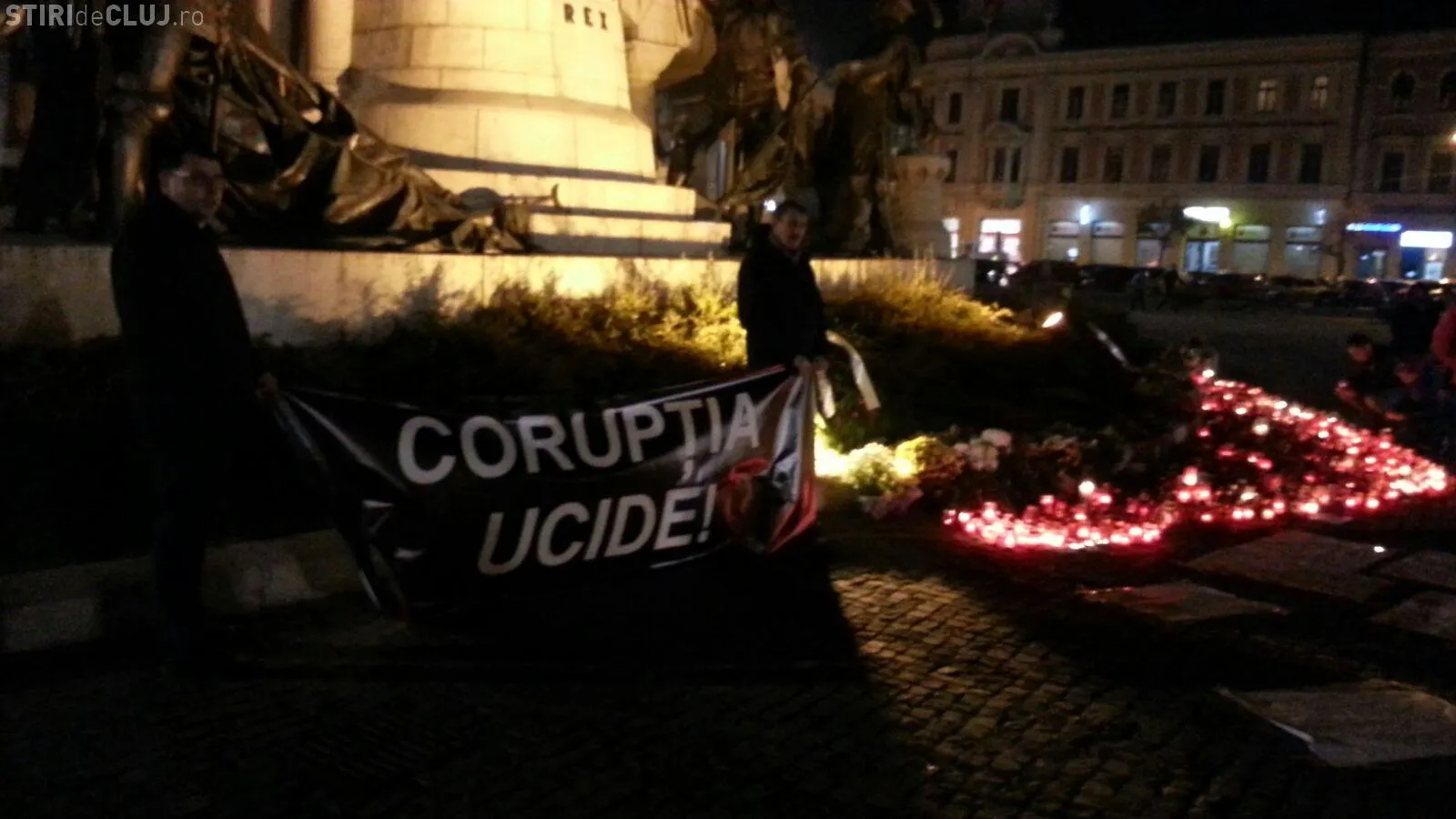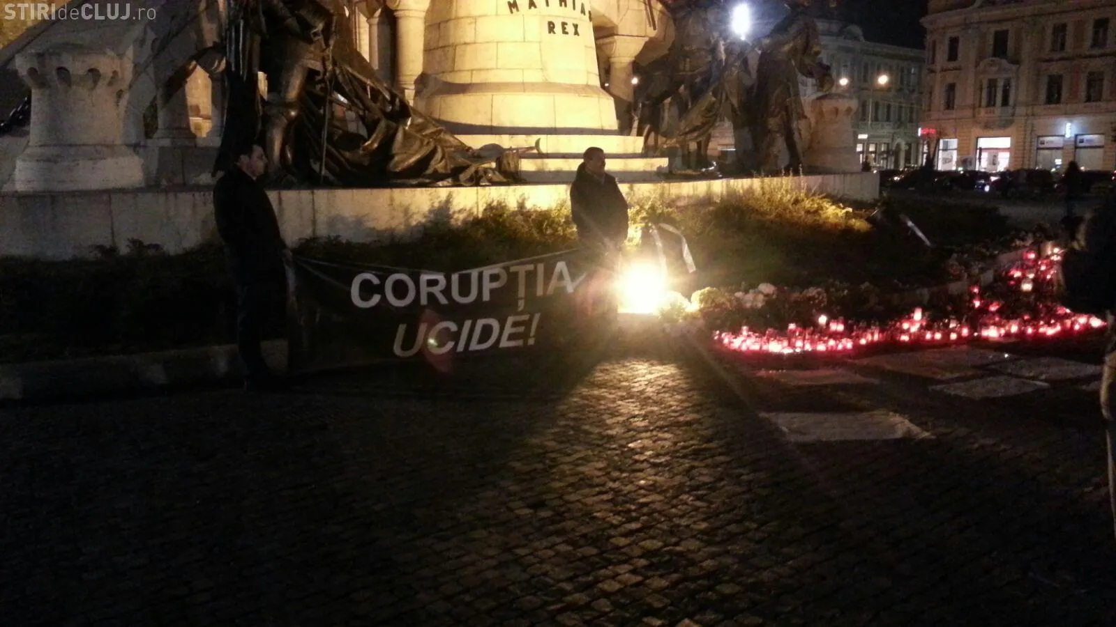 Clujenii au aprins lumânări și au depus flori în memoria victimelor de la Club Colectiv. A fost afișat și un banner.