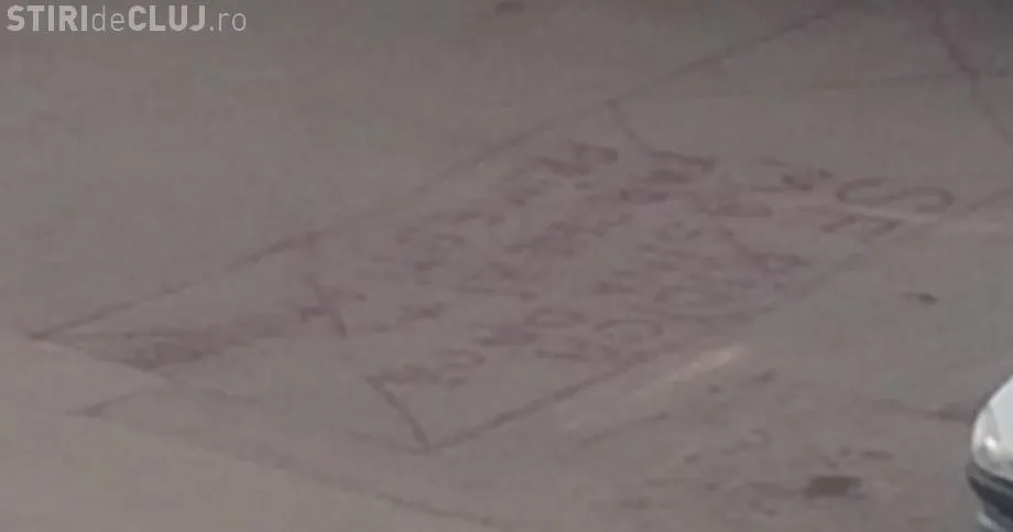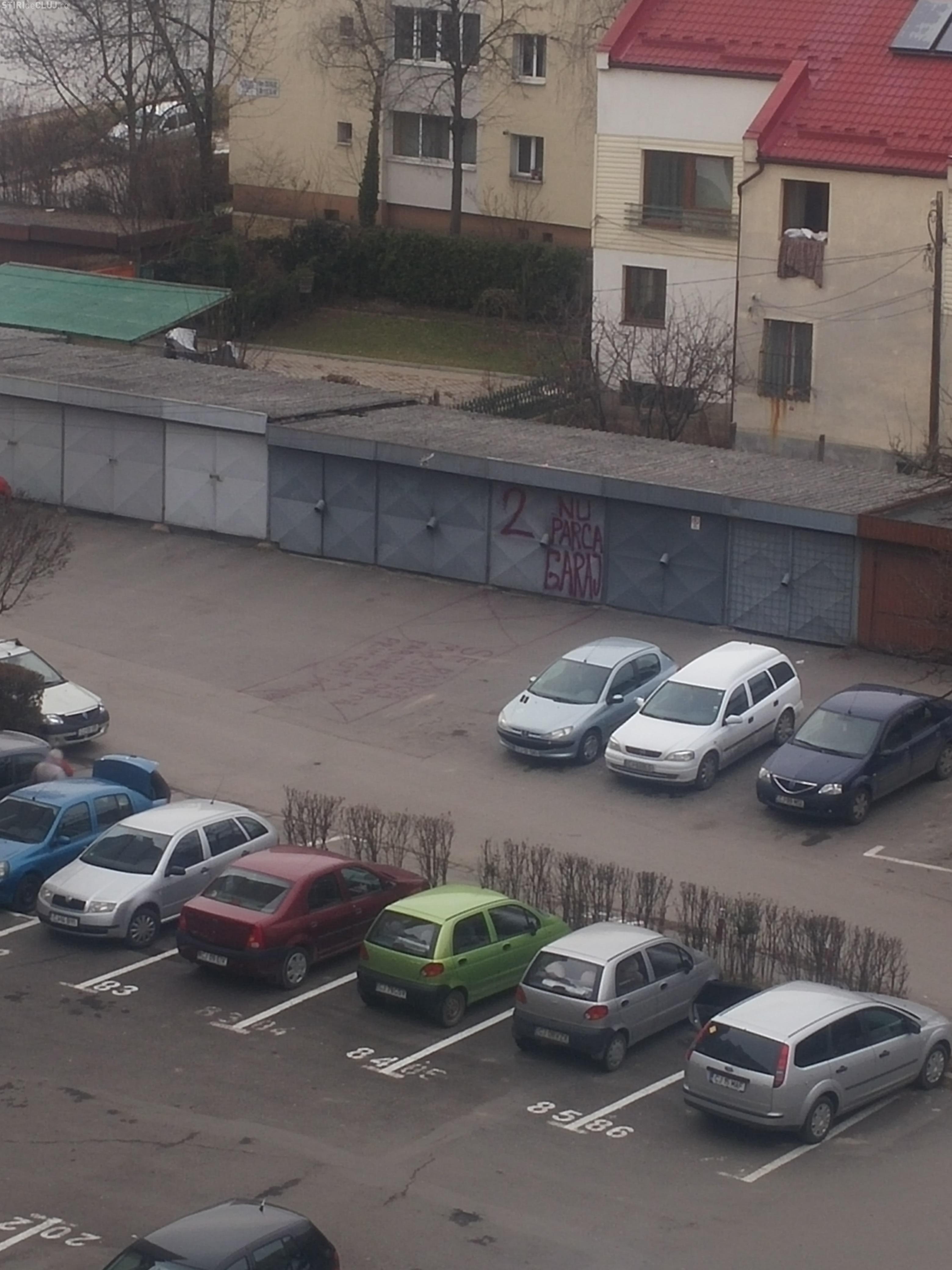 Pentru că a văzut că nu are niciun efect, clujeanul s-a apucat să picteze asfaltul din fața garajului și a scris: ”Se ridică mașina dacă parcați + primiți amendă!”.