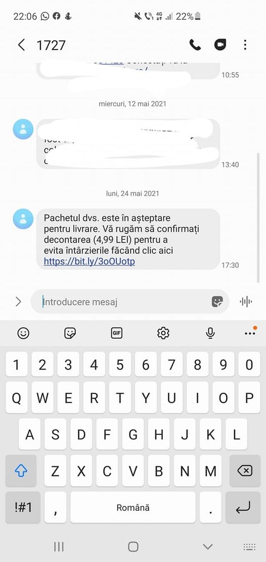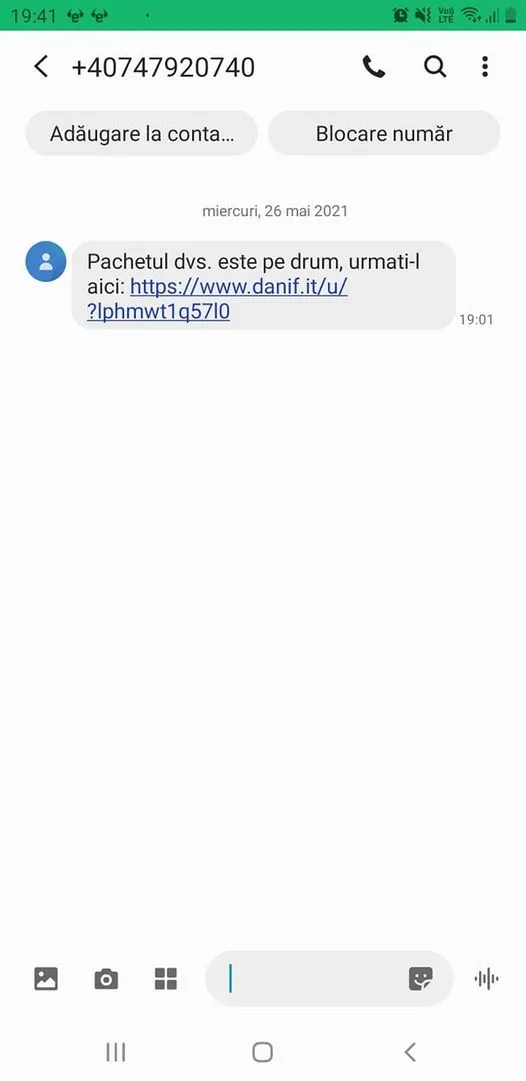 Clientii de telefonie mobila primesc mesaje de pe diverse nr (nationale sau internationale) cu textul “Pachetul dvs. este in drum, urmariti-l aici” urmat de un link.
