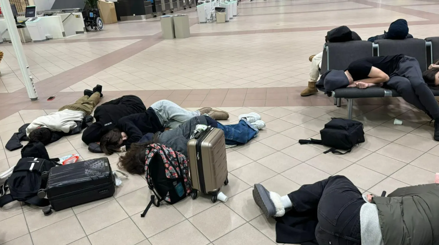 Distanța față de oraș și lipsa conexiunilor de transport pe timpul nopții i-au pus pe călători, printre care mulți copii, în imposibilitatea de a ajunge la o unitate de cazare. Singura opțiune oferită de aeroport a fost un număr de taxi, dar condițiile din terminal au fost departe de a fi potrivite pentru a petrece noaptea acolo.