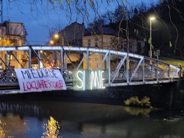 Clujenii cer locuințe sociale și au pus un banner pe podul Elisabeta, pe care scrie ”Mi-e dor de locuințe sociale”, lângă instalația ”Și mie”.