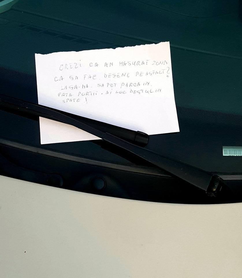 Într-un mesaj lăsat în parbrizul unui șofer, care nu a respectat ”marcajul”, cel care a trasat locul avertizează: ”Crezi că am măsurat zona ca să fac desene pe asfalt? Lasă-mă să pot parca în fața porții. Ai loc destul în spate!”.