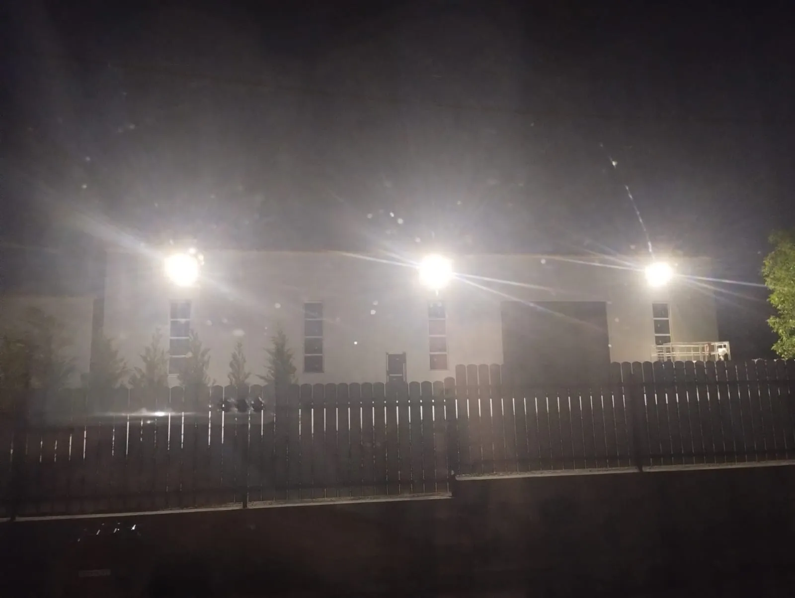 Imaginile video surprind fasciculele de lumină care se proiectează necontrolat în întreaga zonă din fața halei, fără a fi direcționate sau ecranate conform normelor privind iluminatul responsabil și reducerea poluării luminoase.
