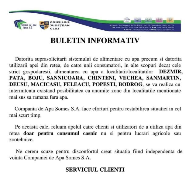Compania de Apă Someș a anunțat că va opri alimentarea cu apă în mai multe localități din județ, pe fondul suprasolicitării rețelei. Motivul invocat este consumul excesiv, inclusiv pentru udatul grădinilor sau umplerea piscinelor, în condițiile în care infrastructura actuală nu poate face față cererii crescute.