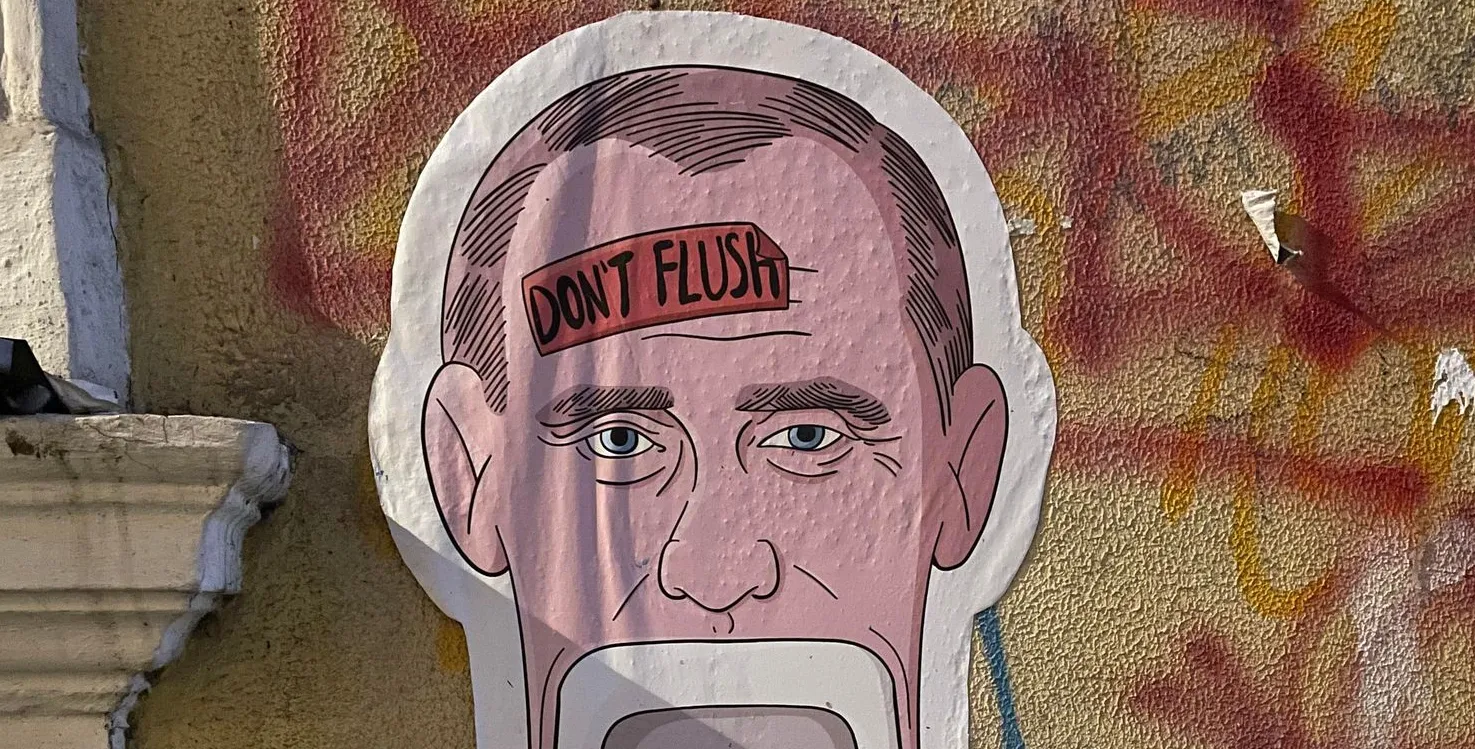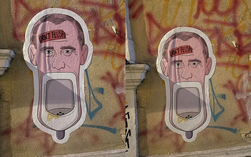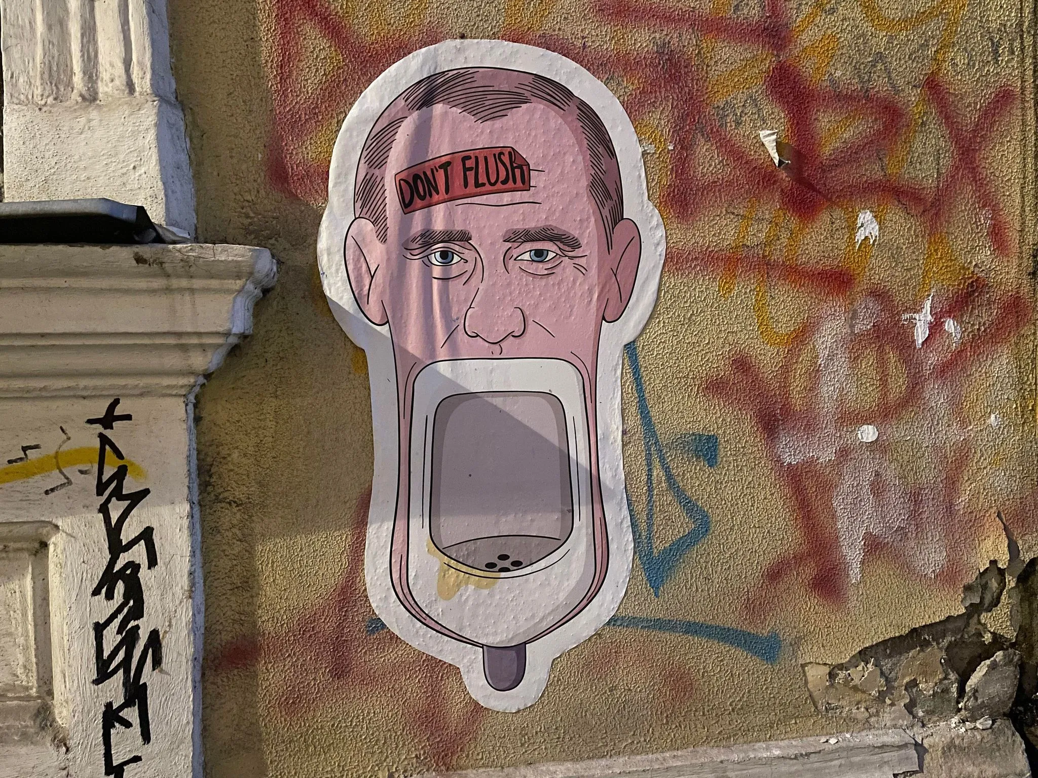 O caricatură în care gura lui Vladimir Putin este înlocuită cu un pișoar a apărut în centrul Clujului pe strada Bolyai.