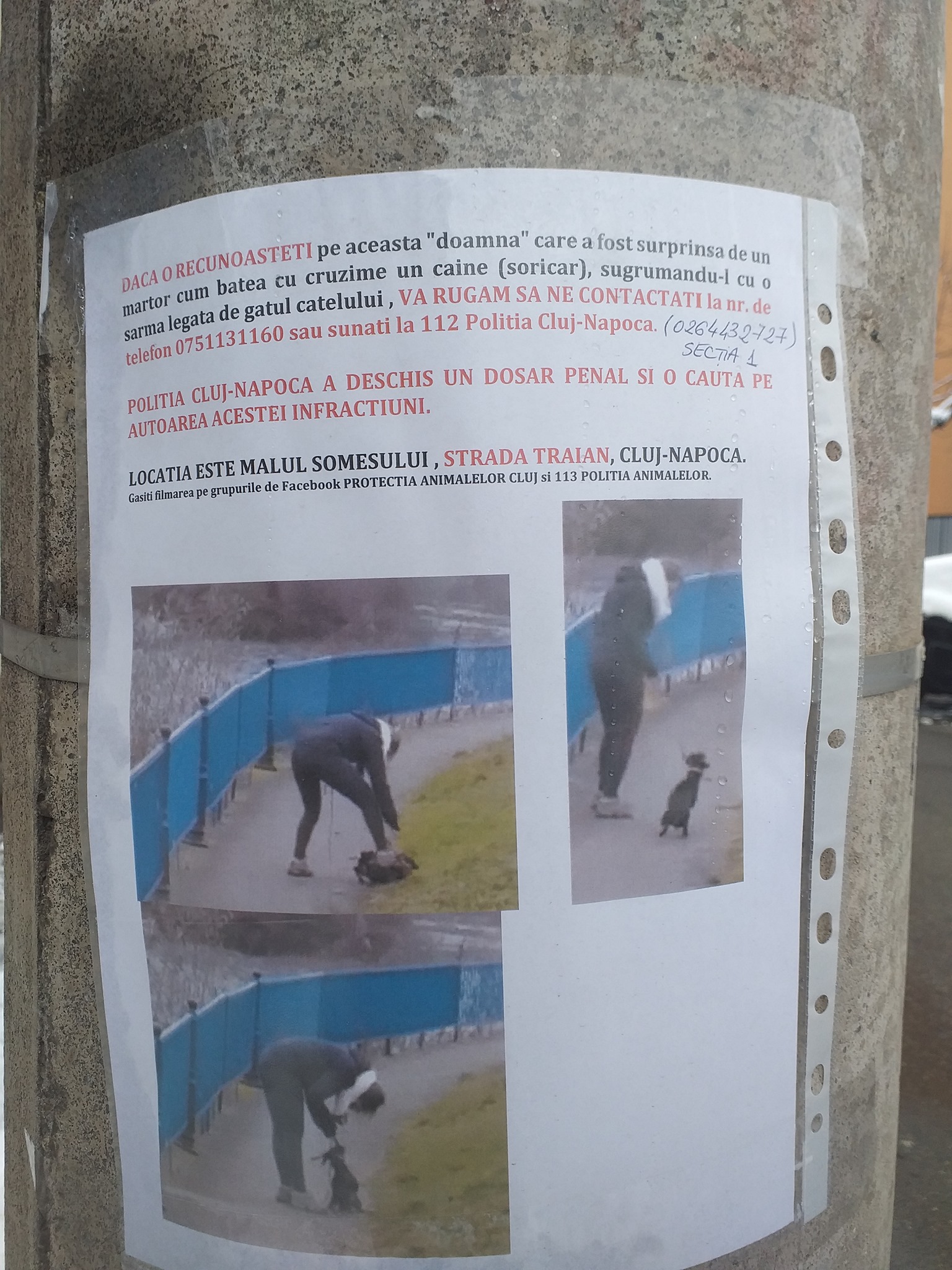 ”Locația este malul Someșului, strada Traian, Cluj-Napoca”, spun iubitorii animalelor. Aceștia cer celor care au informații să sune la 112 sau la numărul de pe afiș.