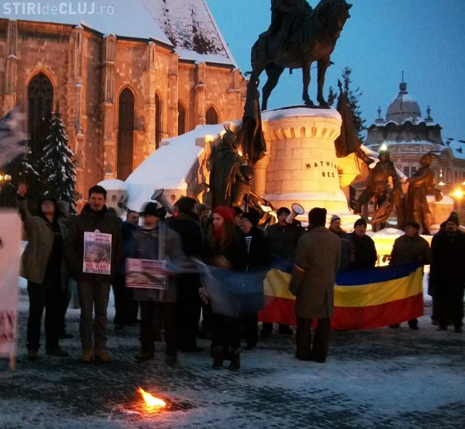 Protestatarii, cei circa 50 la numar, au pornit in marsul traditional pana la Prefectura Cluj si inapoi in Piata Unirii.