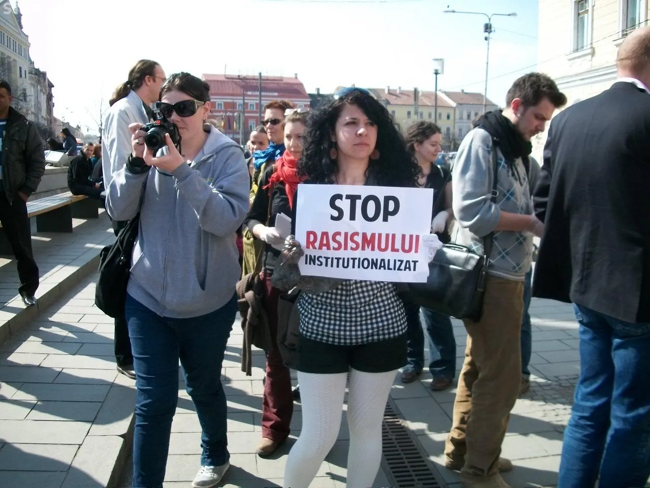 Membrii gLOC au avut la ei pancarte pe care au scris diferite mesaje: "Stop rasismului, stop prejudecatilor", "Vrem un loc de munca", "Si eu sunt gunoier".