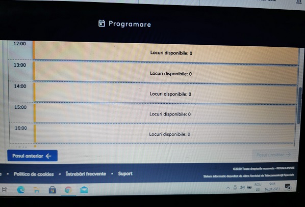 Mai mult, in data de 16 ianuarie, ora 7.45 apareau doua locuri libere pentru data de 31 ianuarie. Acestea erau la scoala Ion Creanga. Am incercat sa rezervam unul dintre ele si programarea s-a putut face pentru prima doza. Surpriza, insa, nu erau locuri pentru rapel, prin urmare, programarea pentru vaccinare nu putea fi confirmata. Poate ne explica cineva cum este posibil sa ai doua locuri libere pentru efectuarea primei doze, dar sa nu ai locuri pentru rapel, desi acestea ar trebui sa coincida in totalitate. Desigur programarea pentru rapel ar fi trebuit sa fie dupa 21 de zile, dar nu se putea face nici mai incolo. Prin urmare, am incercat sa cautam o alta data. Si...o alta surpriza neplacuta. Nu mai era niciun loc liber si disparuse si programarea de pe 31 ianuarie, desi pe acelea eram noi intre timp si erau blocate pentru programare. Pe calendarul din platforma apar doar posibilitati de programari (cu locuri epuizate) pana in 7 februarie. Dupa aceasta data nu mai apare nimic.