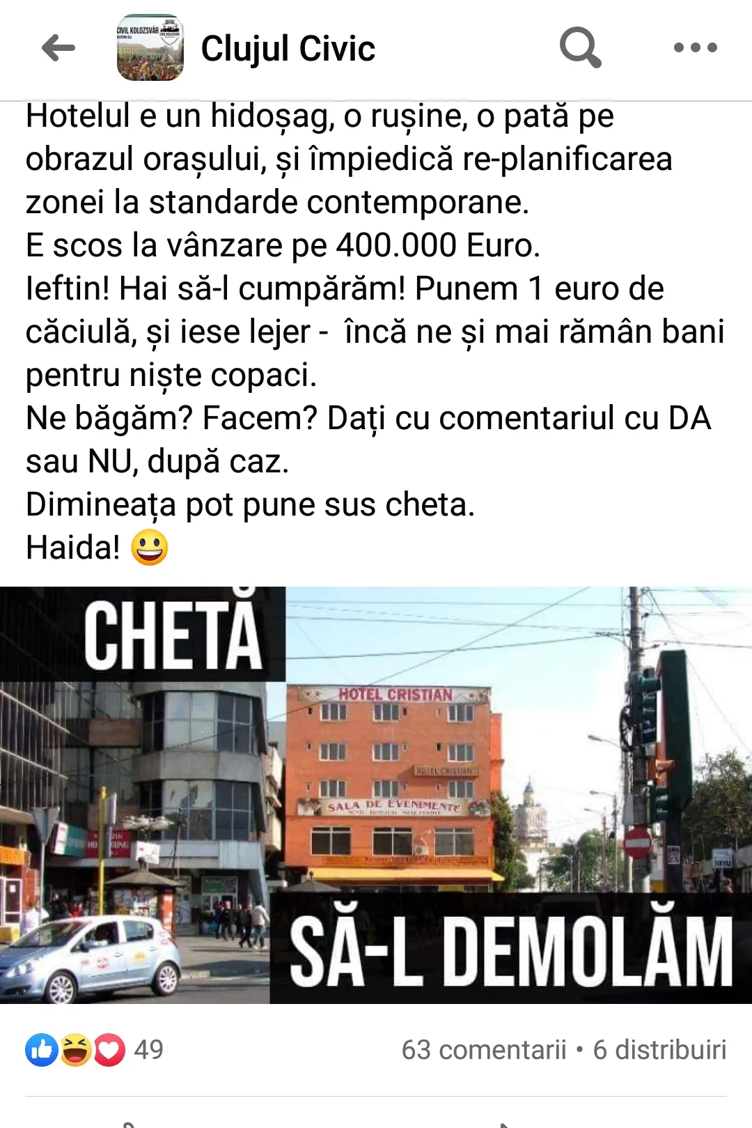Hai să cumpărăm Hotelul Cristian și să-l donăm Primăriei Cluj-Napoca pentru a fi demolat.