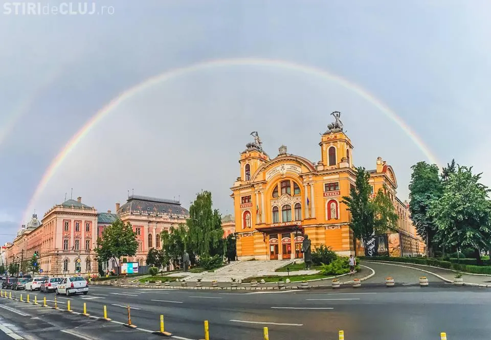 Curcubeul a dat semnul că vremea rea este ”istorie”, iar unii clujeni au imortalizat scena. Fotografia în care curbuceul acoperă ca într-un glob Teatrul Național din Cluj-Napoca poate deveni lejer o imagine pe o carte poștală.