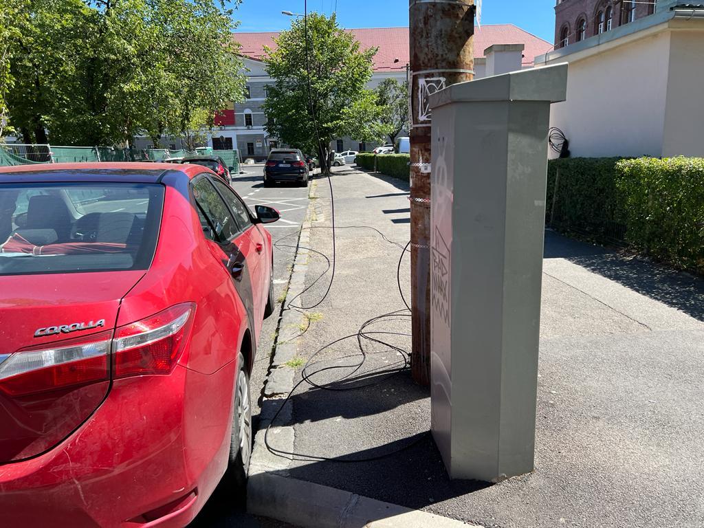 Firul de pe stâlp se află pe trotuar și poate fi atins de un trecător în orice moment. Un clujean cu spirit civic ne-a reclamat situația, precizând că nimeni nu vrea să intervină.