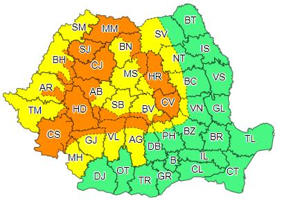 În zonele montane și submontane vor fi perioade cu averse torențiale, iar în intervale scurte de timp, dar mai ales prin acumulare se vor înregistra cantități de apă de 40 - 60 l/mp și pe arii restrânse de peste 70 - 80 l/mp. Acestea vor fi asociate și cu descărcări electrice, intensificări ale vântului și izolat grindină.