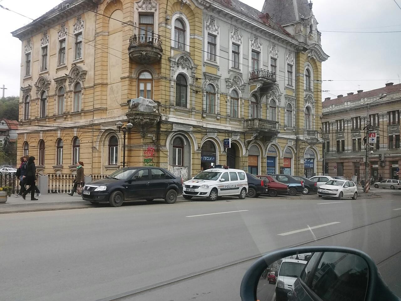Două mașini de Poliție stau frumos parcate pe podul Horea, în timp ce agenții de la rutieră sunt la cantină.