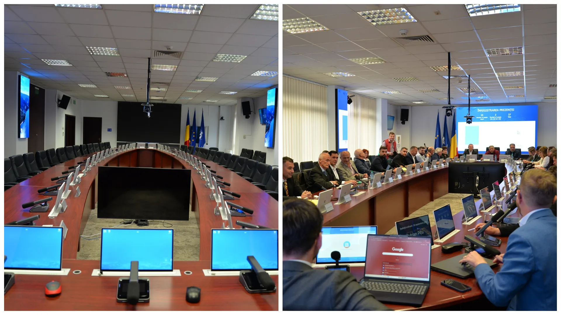 Prezența la ședință, votul și afișarea rezultatelor se fac în timp real, pe ecrane LED moderne, eliminând complet tipărirea documentelor și reducând semnificativ consumul de resurse.
