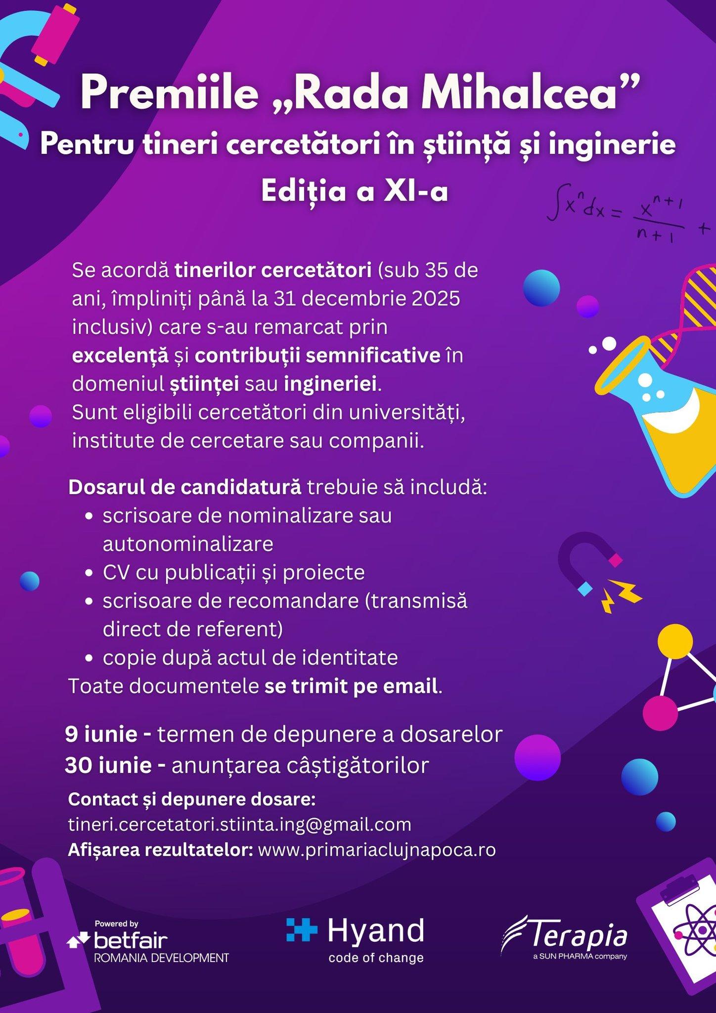 Municipiul Cluj-Napoca continuă să investească în viitor prin susținerea excelenței în cercetare. A fost lansată ediția a XI-a a Premiilor „Tineri Cercetători în Știință și Inginerie”, un demers unic în România, inițiat de Primăria Cluj-Napoca în parteneriat cu Prof. Dr. Rada Mihalcea.