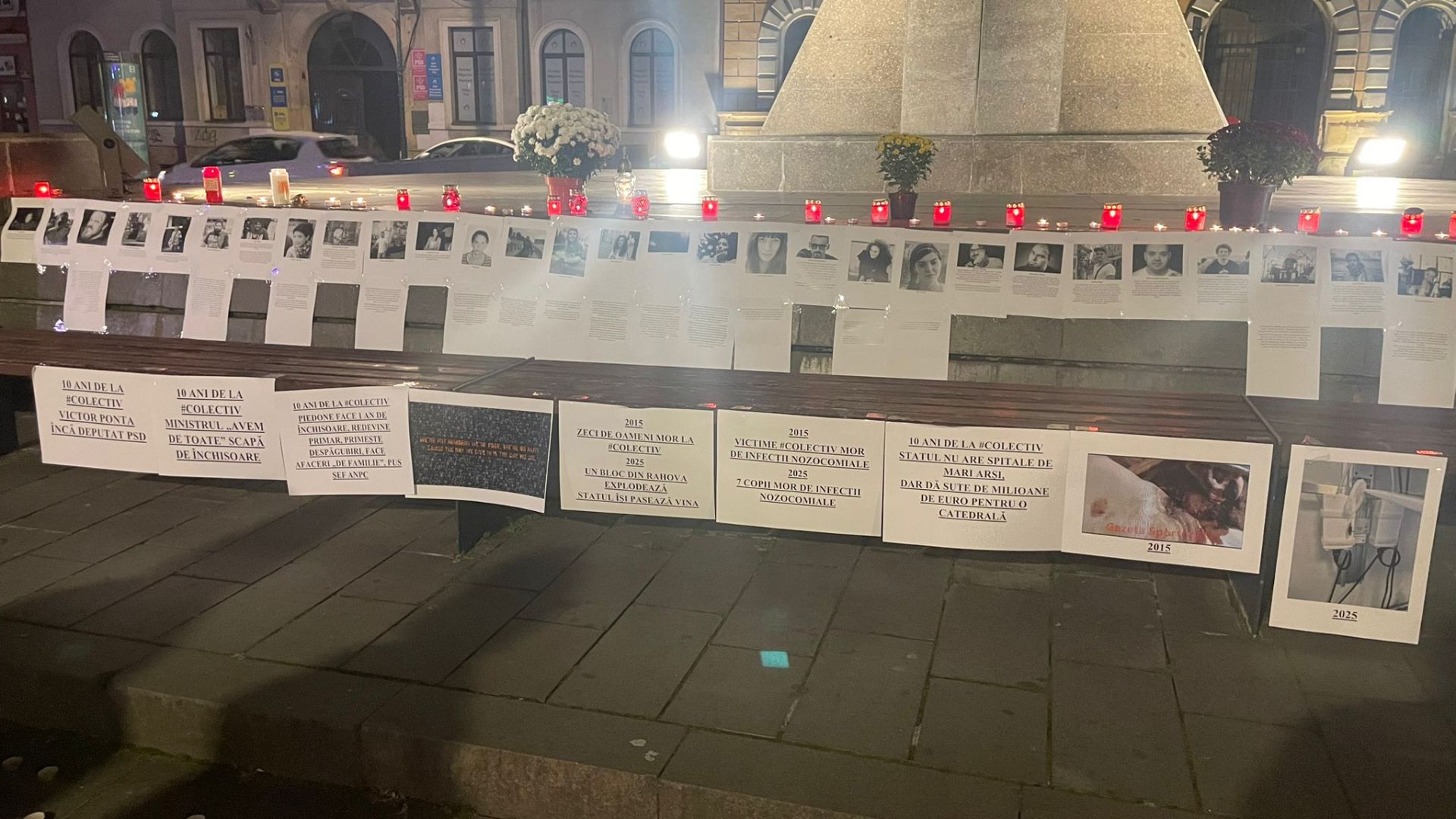 Printre lumânări, pot fi citite mesaje puternice, scrise pe foi simple sau carton colorat, care ating direct rana unei țări întregi: „Corupția ucide”, „Nu v-am uitat”, „2015: Zeci de oameni mor la Colectiv; 2025: Un bloc din Rahova explodează, statul își pasează vina.”.