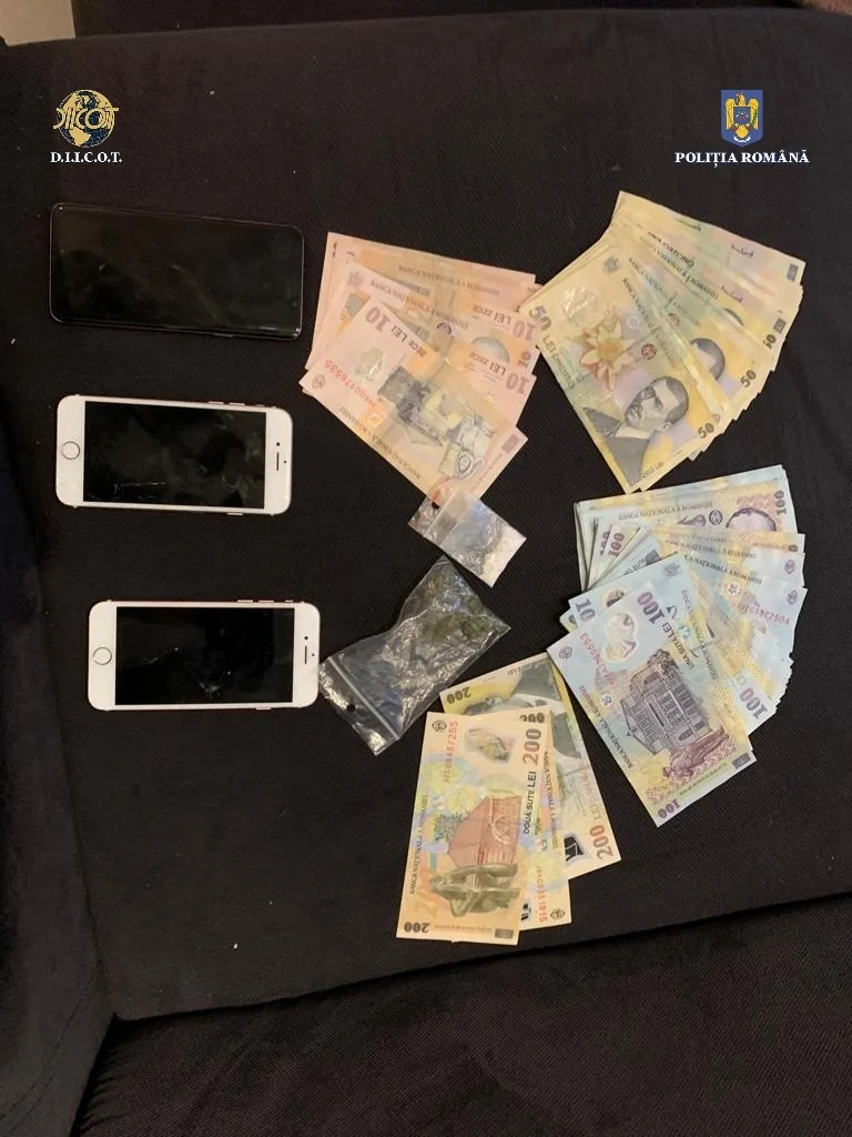 În urma perchezițiilor desfășurate, au fost descoperite și ridicate, în vederea continuării cercetărilor, 5 telefoane mobile, înscrisuri cu valoare probatorie, 1 plic conținând substanță vegetală, verde-oliv, un plic cu substanță pulverulentă, albă, 7.500 de lei și 1.000 de franci elvețieni.