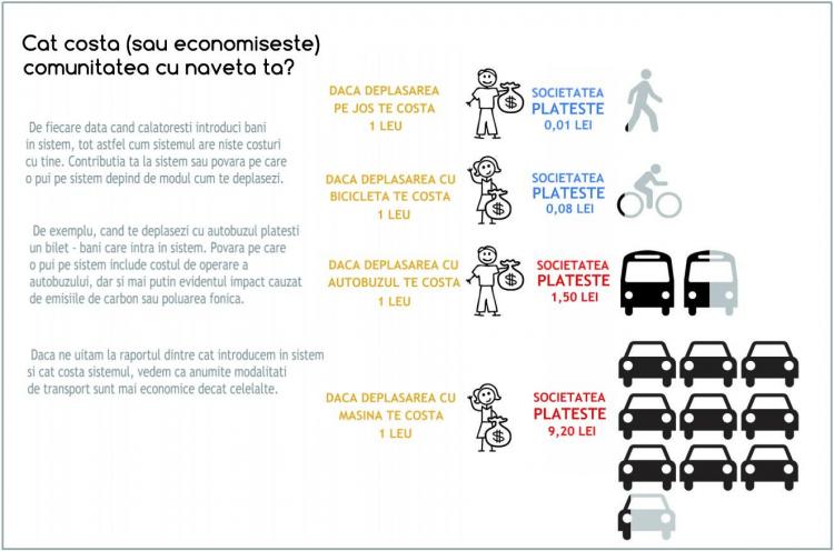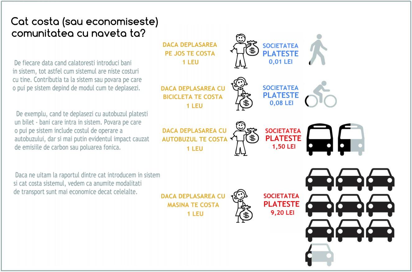 Aceste cinci idei (vezi imagini pentru detalii) pot fi implementate separat sau impreuna fara a ridica semnificativ costul. Trebuie insa mentionat ca limitarea sau suprataxarea masinilor care ingreuneaza traficul trebuie dublata de o extindere a retelei de autobuze astfel incat sa existe o alternativa viabila si confortabila la masina personala. Ideal ar fi ca orice persoana sa poata ajunge pe jos in cel mult zece minute la cea mai apropiata statie. Si orice persoana sa ajunga in maxim 30-40 de minute la destinatie (in interiorul orasului). De asemenea biletul sa fie valabil o ora din momentul validarii, indiferent cate autobuze schimbi. Intrebarea nu e cat costa investitia, ci cat ne costa pe toti daca nu o implementam, mai devreme sau mai tarziu. A aglomera orasul cu masini e ca si cum ti-ai umple apartamentul cu mobila. Orasul e pentru oameni, iar strategia de dezvoltare trebuie sa aiba in centru cetateanul, nu masinile. Daca reteaua de autobuze ar fi mai extinsa si mai densa, soferii ar fi mai inclinati sa aleaga transportul in comun. Pana la urma nici unui sofer nu-i place sa stea in trafic sau sa caute disperat un loc de parcare. Iar pentru cei care au avut experienta traficului din Bucuresti, acesta e ultimul lucru pe care ni-l dorim la Cluj. Si nu suntem departe. De ce ar trebui sa alegi autobuzul? - economie de bani (platesti doar biletul); - nu mai pierzi timpul cautand loc de parcare; - poluarea, inclusiv cea fonica, e redusa drastic; - poti sa citesti o carte, sa stai pe net; - wi-fi gratuit, aer conditionat, oameni noi.